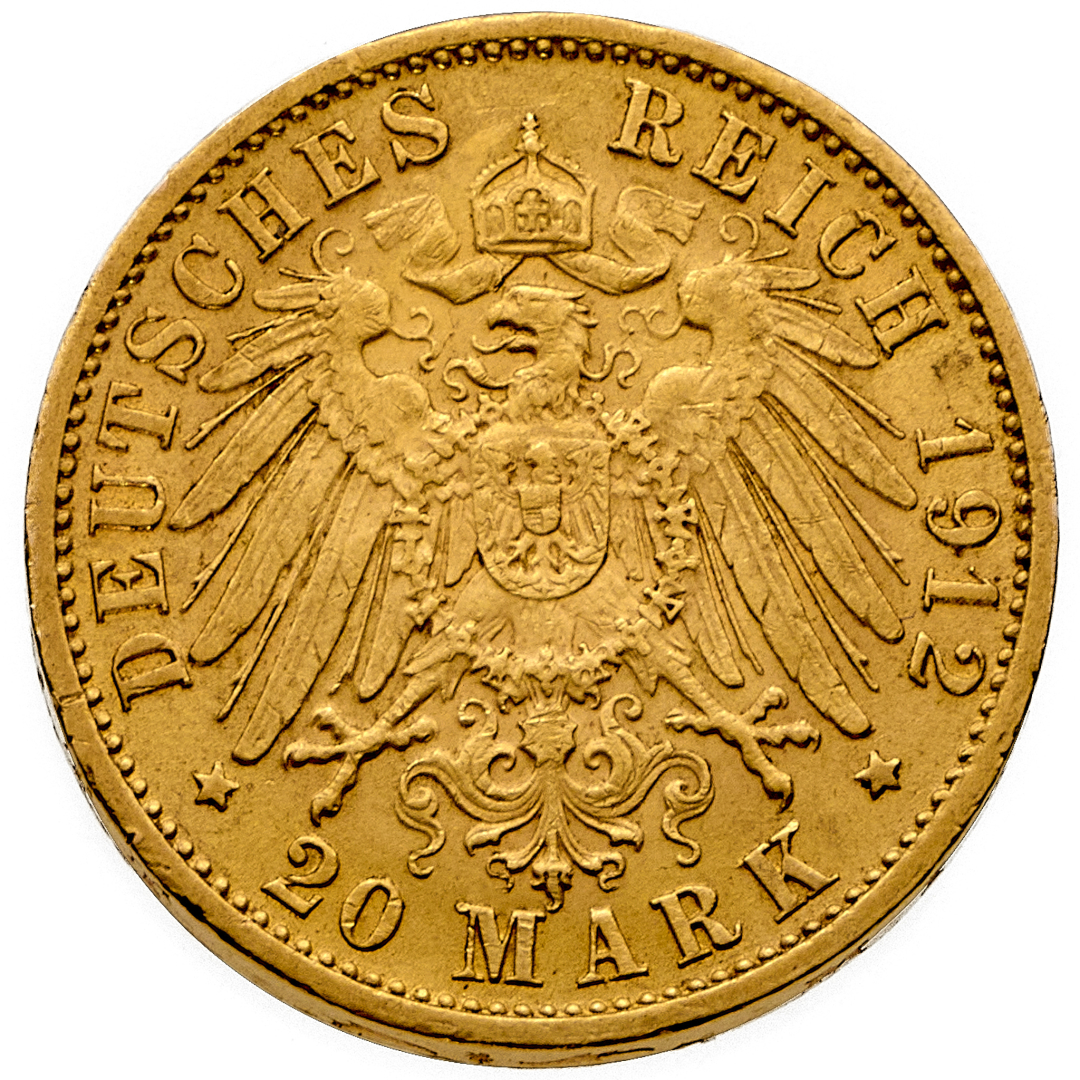 Baden - Friedrich II (1907-1918) - 20 Marchi 1912 - Zecca: Karlsruhe - Diritto: effigie del Re a sinistra - Rovescio: aquila imperiale coronata - gr. 7,97 - Lievi segni di contatto, SPL