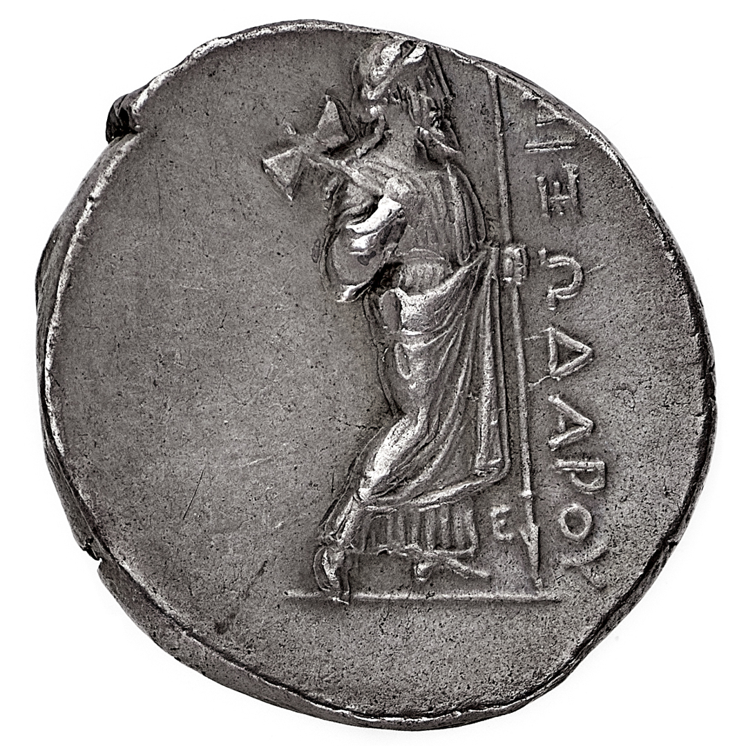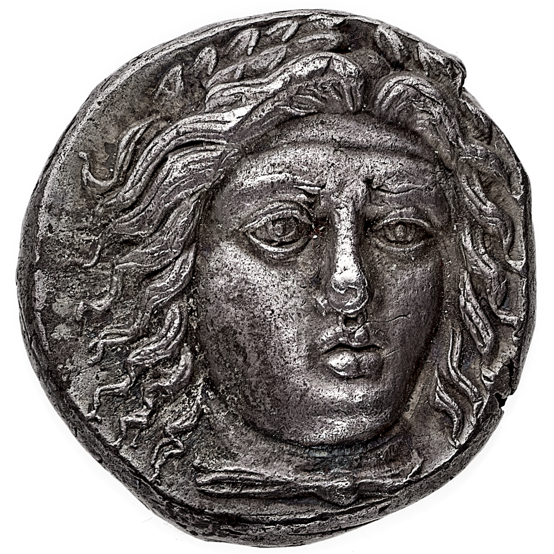 Pixodauro (340-334 a.C.) - Tetradramma - Zecca: Alicarnassus - Diritto: testa di Apollo di tre quarti - Rovescio: Zeus Labraundos stante a destra indossa una lunga veste, tiene una doppia ascia (labrys) con la mano destra e una lancia con la sinistra - gr. 15,24 - Rara - Patina di medagliere e alti rilievi, q.SPL - Corredata da cartellino Leu Numismatik AG