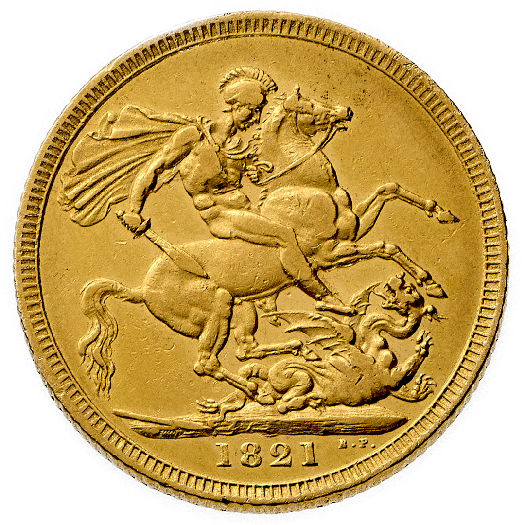 George IV (1820-1830) - Sovereign 1821 - Zecca: Londra - Diritto: effigie del Re a sinistra - Rovescio: San Giorgio a cavallo trafigge il drago - gr. 7,95 - SPL