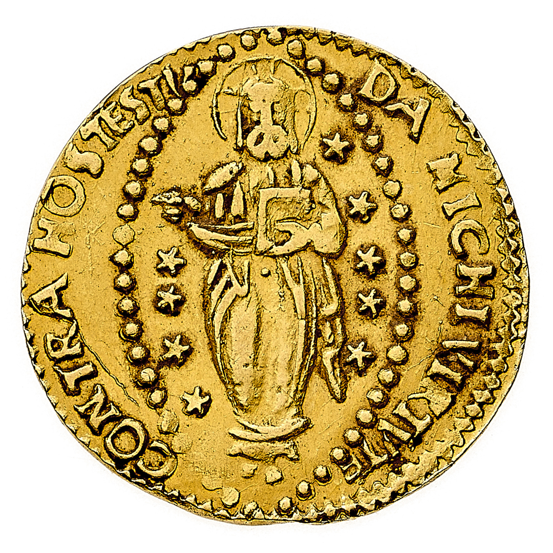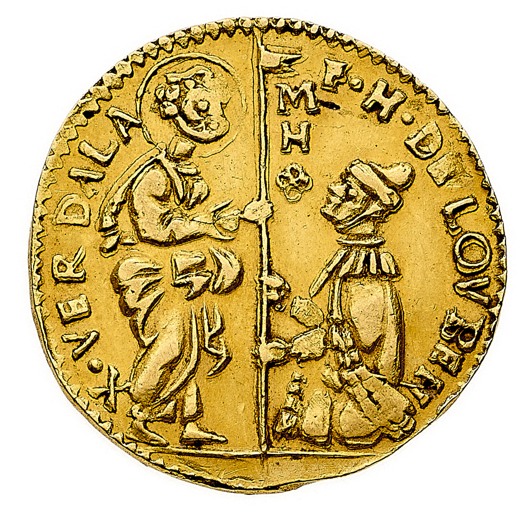 Hugues Loubens de Vardalle (1582-1595) - Zecchino - Diritto: San Giovanni porge il vessillo al Grande Maestro genuflesso - Rovescio: Gesù Cristo benedicente entro una cornice a mandorla - gr. 3,41 - Rara - q.SPL