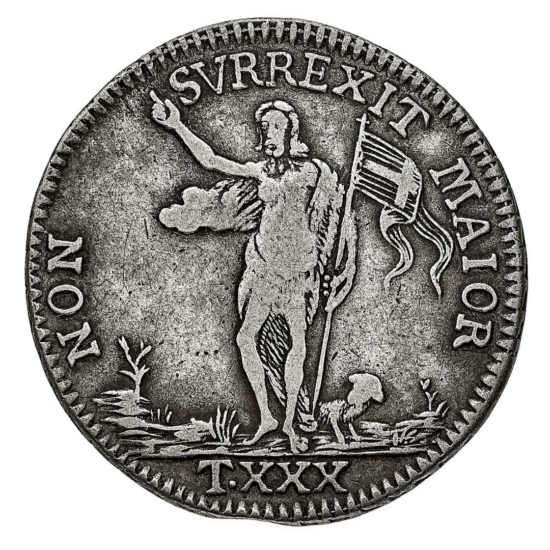 Emmanuel Pinto (1741-1773) - 30 Tarì 1768 - Diritto: stemma in cartella ornata e coronata - Rovescio: San Giovanni stante di fronte tiene il vessillo dell'Ordine con la mano destra; ai suoi piedi, a destra, un agnello accosciato - gr. 29,36 - BB
