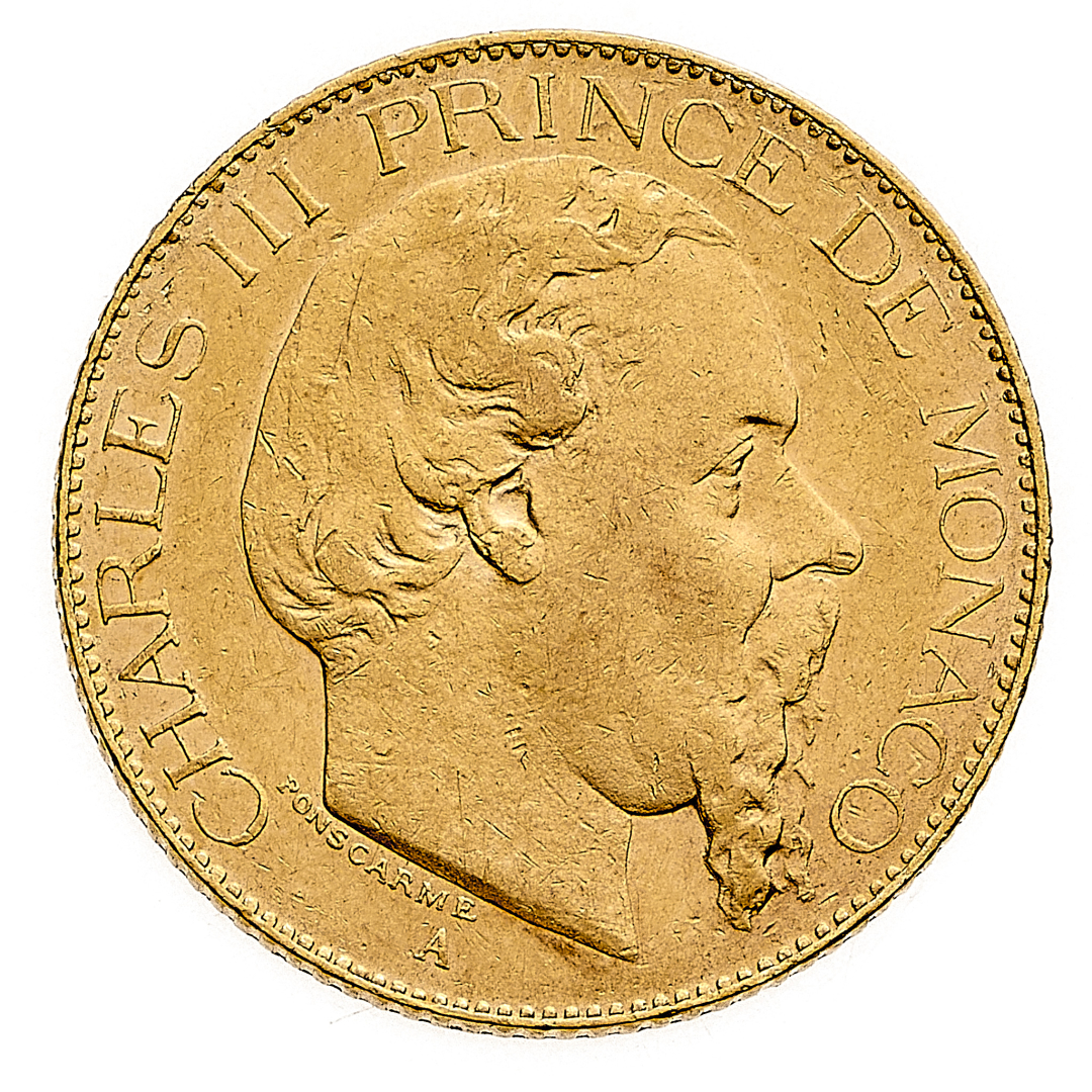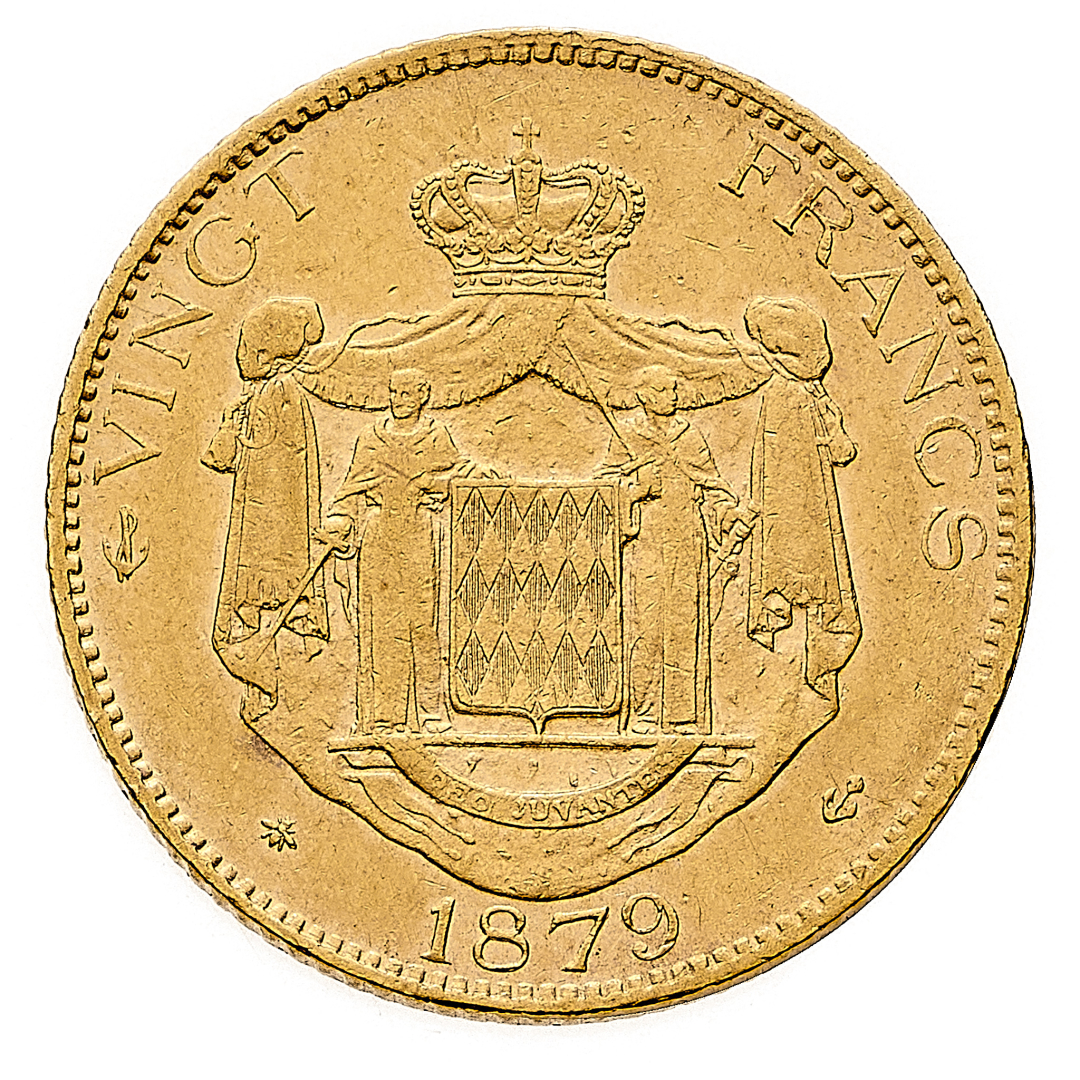 Charles III (1856-1889) - 20 Franchi 1879 - Zecca: Parigi - Diritto: effigie del Principe a destra - Rovescio: stemma coronato - gr. 6,46 - SPL