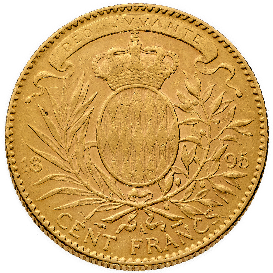 Albert I (1889-1922) - 100 Franchi 1895 - Zecca: Parigi - Diritto: effigie del Principe a sinistra - Rovescio: stemma ovale coronato entro due rami di palma e di alloro annodati alla base - gr. 32,25 - Lievi segni di contatto, migliore di SPL