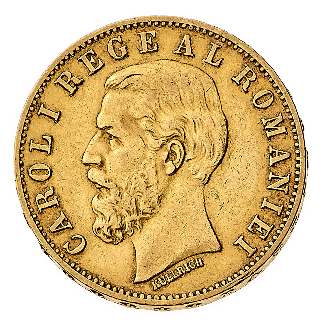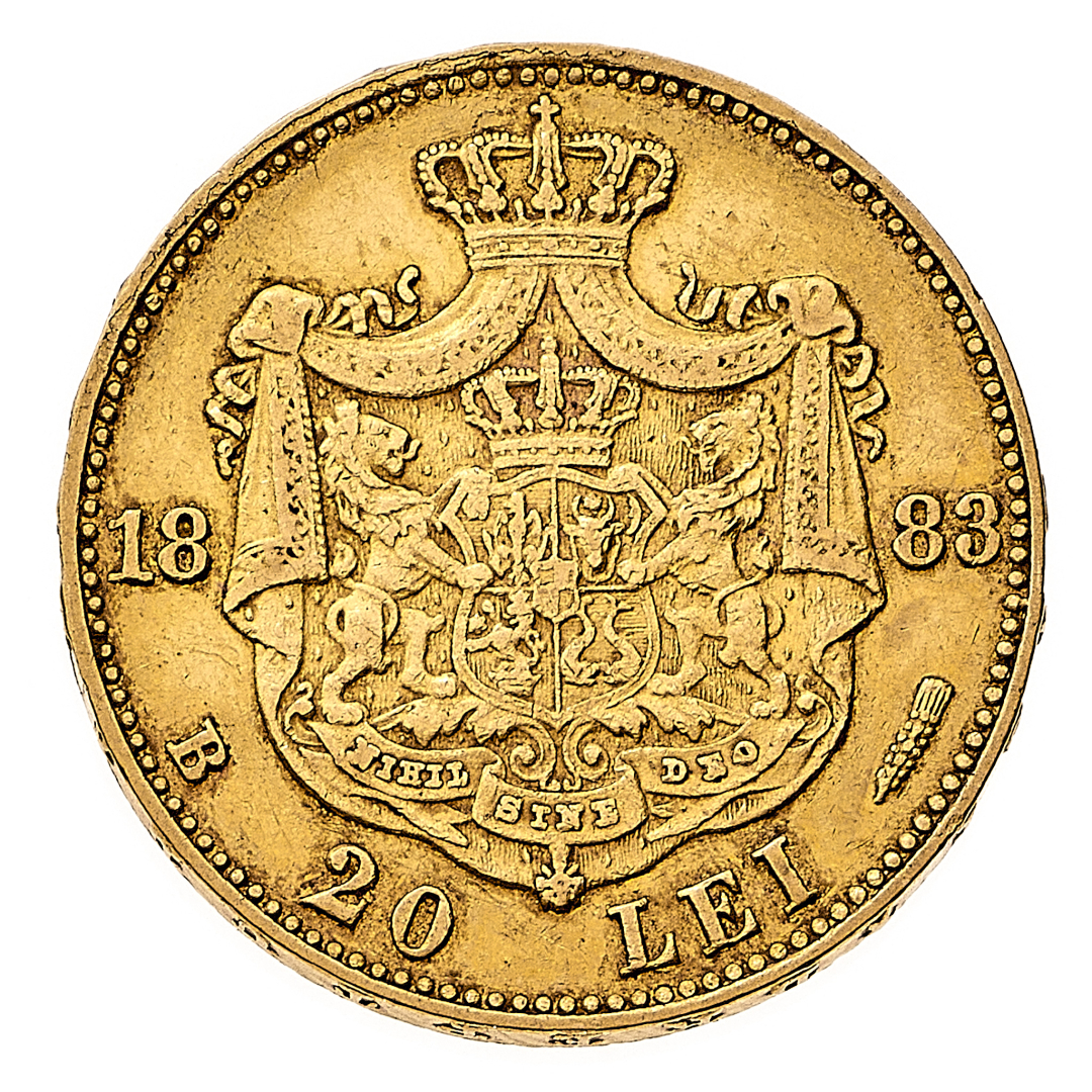 Carol I (1881-1894) - 20 Lei 1883 - Zecca: Bucarest - Diritto: effigie del Re a sinistra - Rovescio: stemma coronato - gr. 6,44 - Migliore di BB