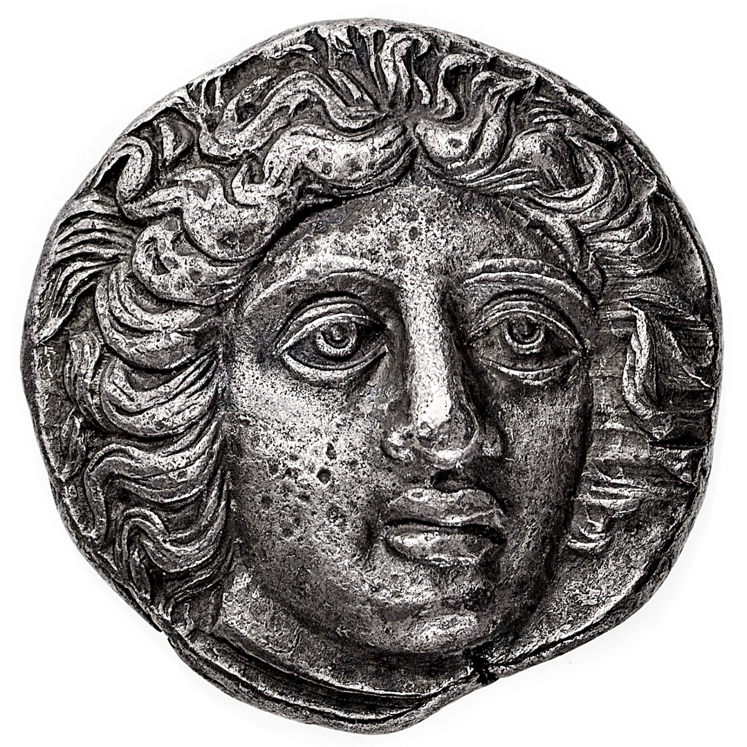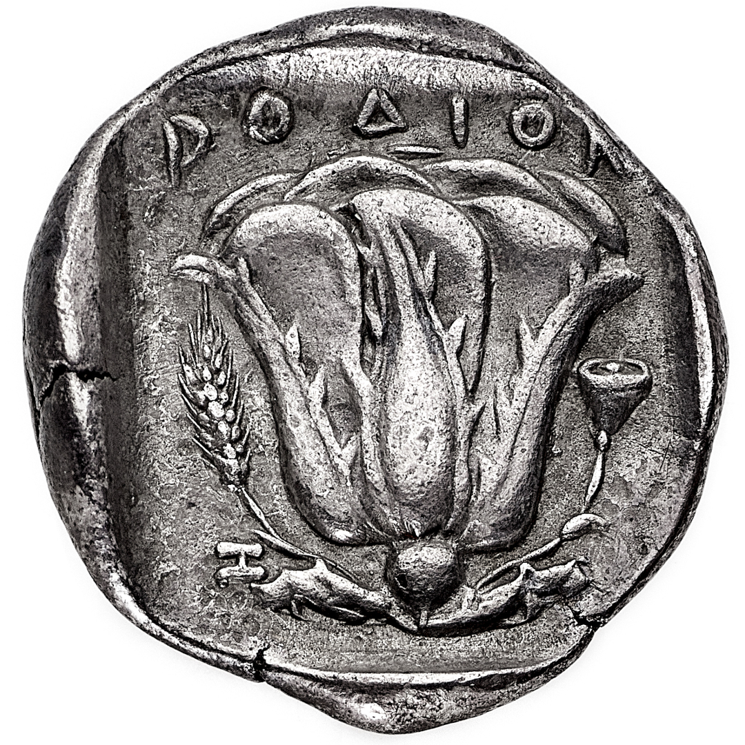 Rodi - Tetradramma databile al periodo 404-385 a.C. - Diritto: testa di Helios di tre quarti verso destra - Rovescio: rosa con germoglio a destra; nel campo a sinistra, una spiga di grano - gr. 15,09 - Molto rara - Magnifico stile, alti rilievi e patina di medagliere, q.SPL - Proveniente dall'asta Dr. Busso Peus Nachf. 368, Frankfurt am Main 25.4.2001, n. 203