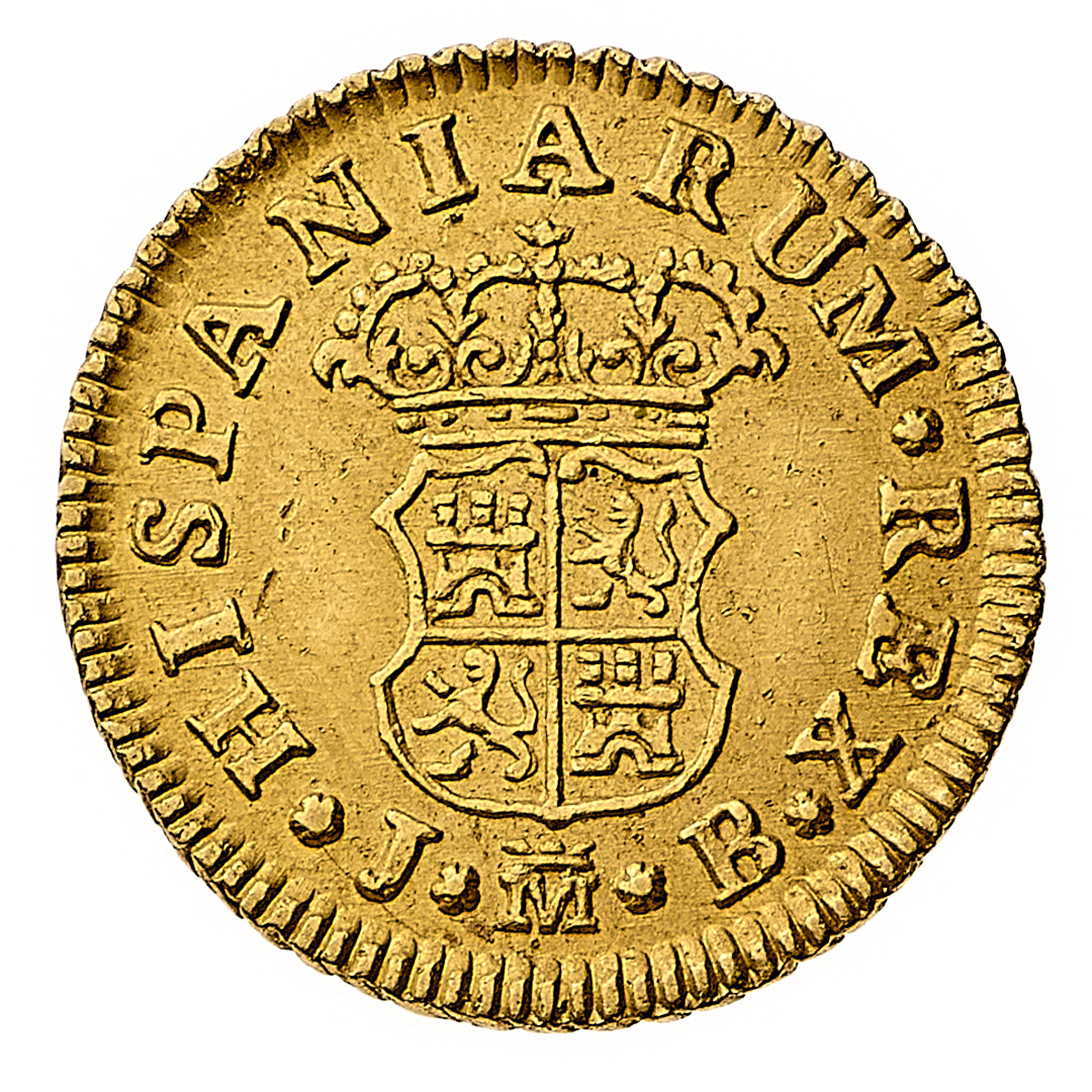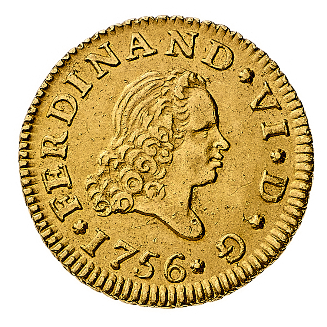 Ferdinando VI (1746-1759) - 1/2 Escudo 1756 - Zecca: Madrid - Diritto: effigie del Re a destra - Rovescio: stemma coronato - gr. 1,78 - SPL