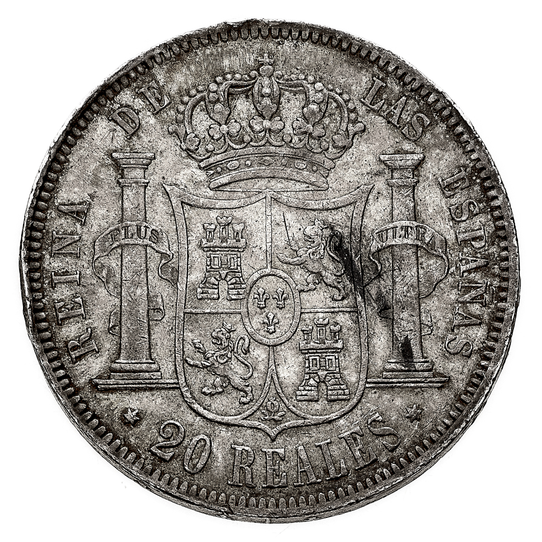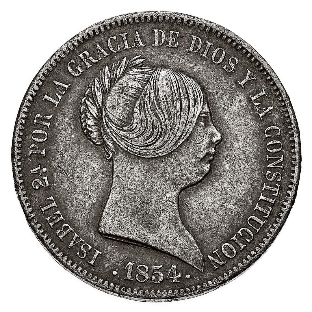 Isabella II (1833-1868) - 20 Reales 1854 - Zecca: Madrid - Diritto: effigie della Regina a destra - Rovescio: stemma entro padiglione ornato e coronato - gr. 25,88 - Lieve colpetto al contorno, q.SPL