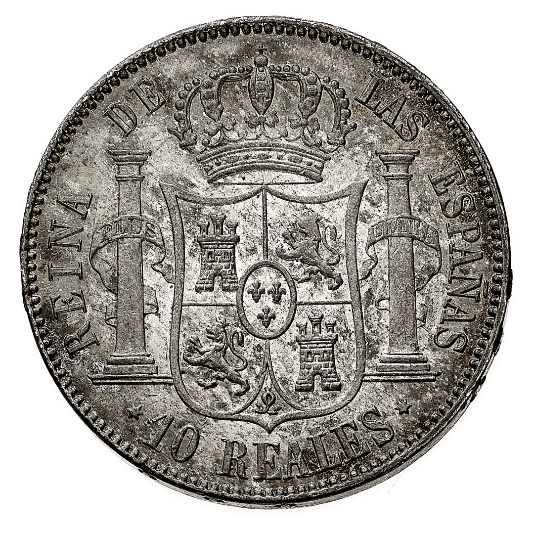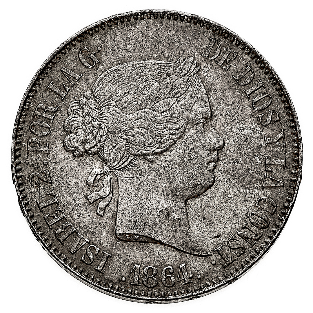 Isabella II (1833-1868) - 10 Reales 1864 - Zecca: Madrid - Diritto: effigie della Regina a destra - Rovescio: stemma entro padiglione ornato e coronato - gr. 12,92 - Splendida patina con riflessi iridescenti, migliore di SPL