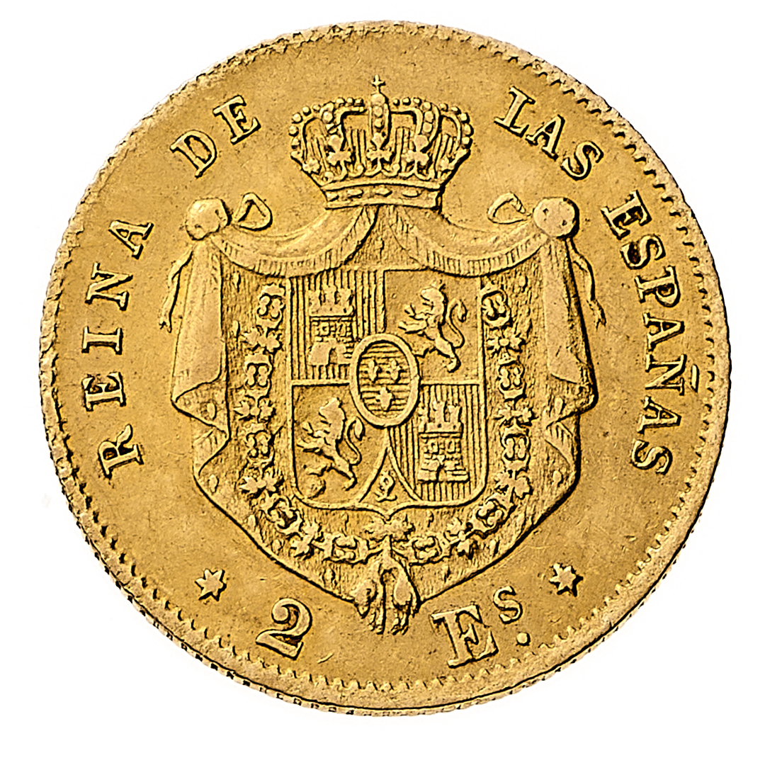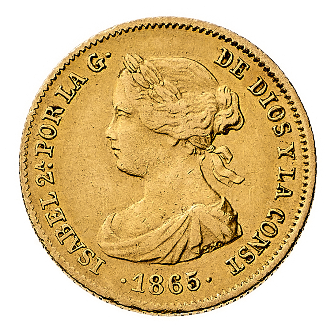 Isabella II (1833-1868) - 2 Escudos 1865 - Zecca: Madrid - Diritto: effigie della Regina a sinistra - Rovescio: stemma circondato dal Collare del Toson d'Oro entro padiglione ornato e coronato - gr. 1,71 - q.SPL