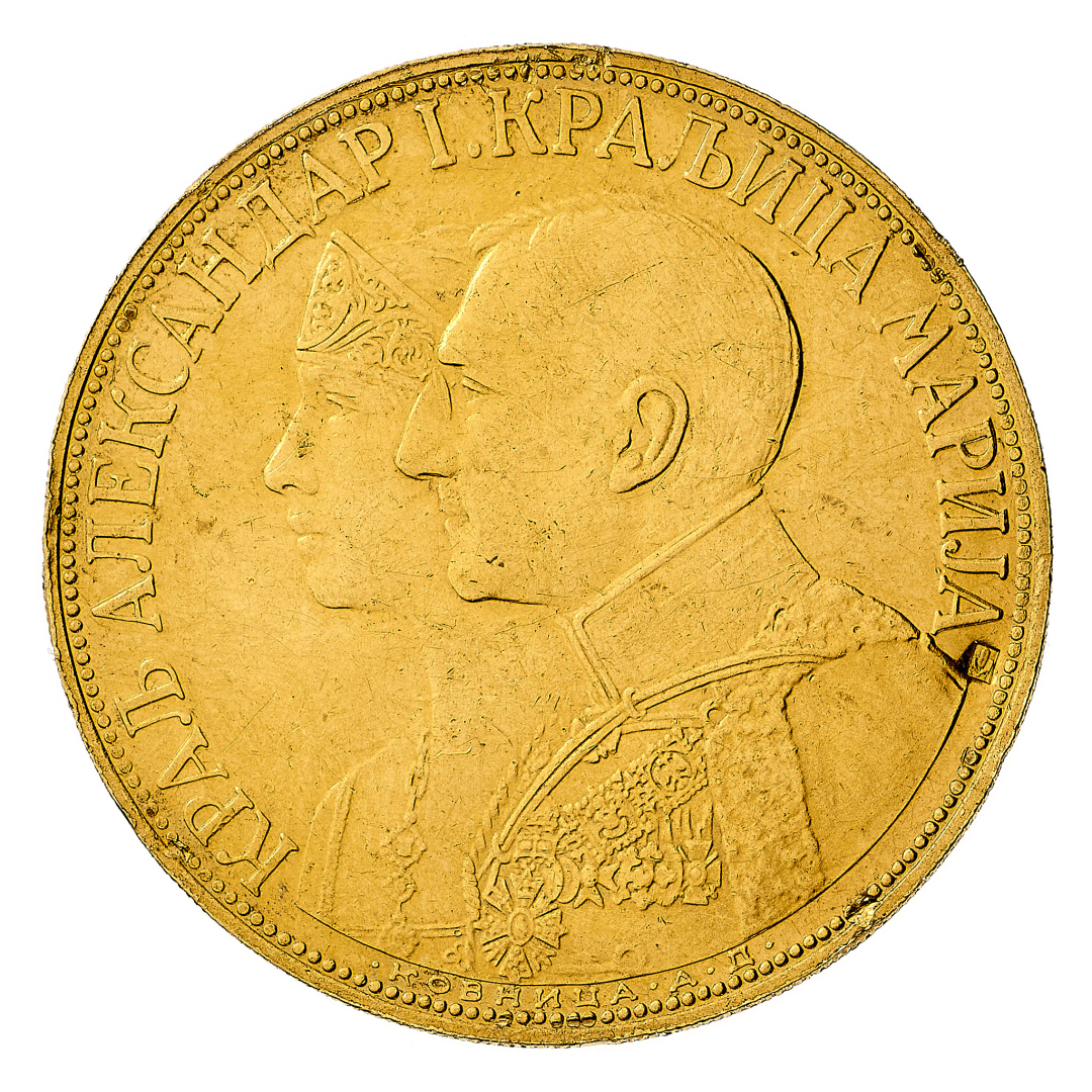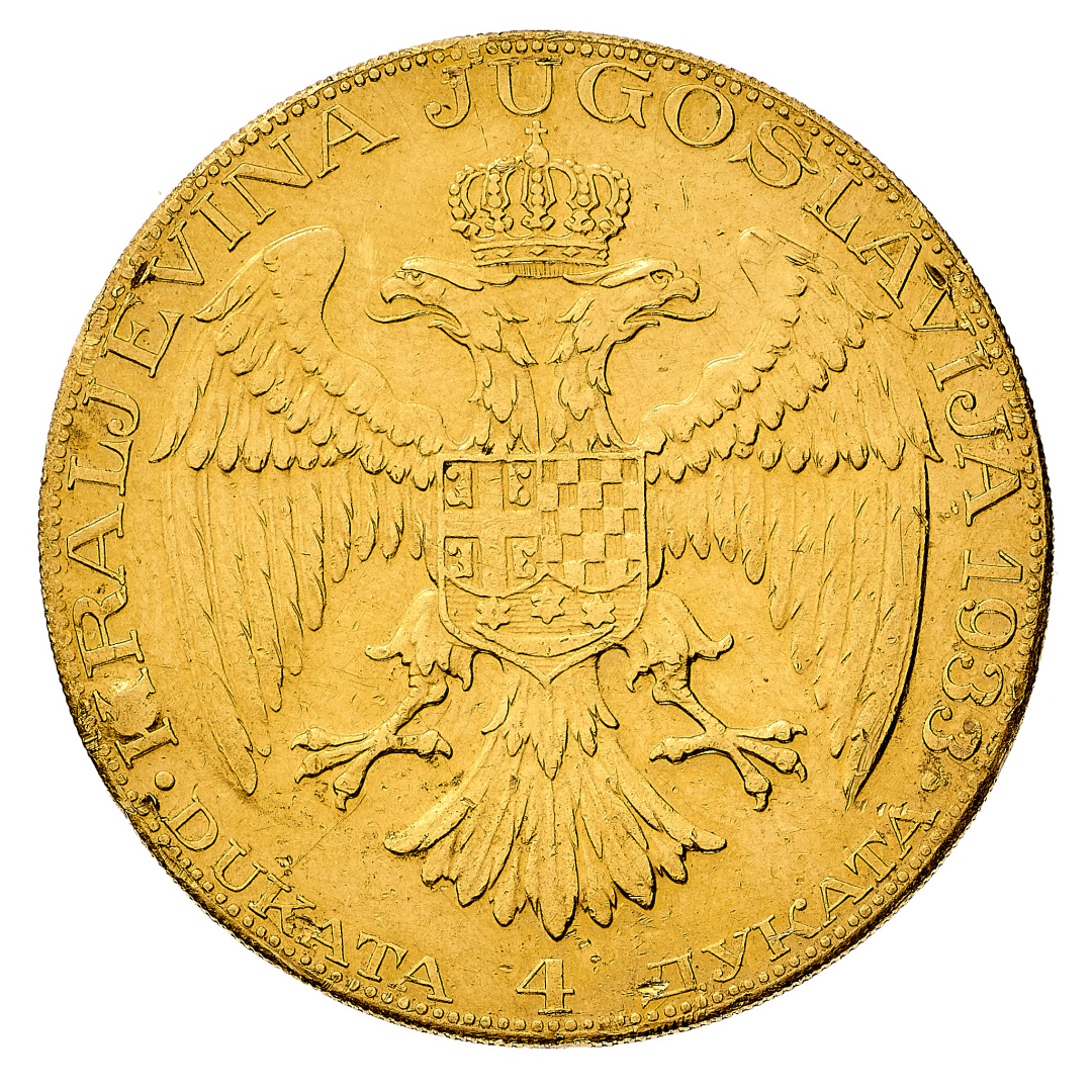 Alexander I (1921-1934) - 4 Ducati 1933 - Zecca: Belgrado - Diritto: busti accollati del Re e della Regina a sinistra - Rovescio: aquila bicipite con stemma in petto - gr. 13,95 - Contromarca al diritto "Bosnian sword" - Probabili tracce di montatura, altrimenti q.SPL