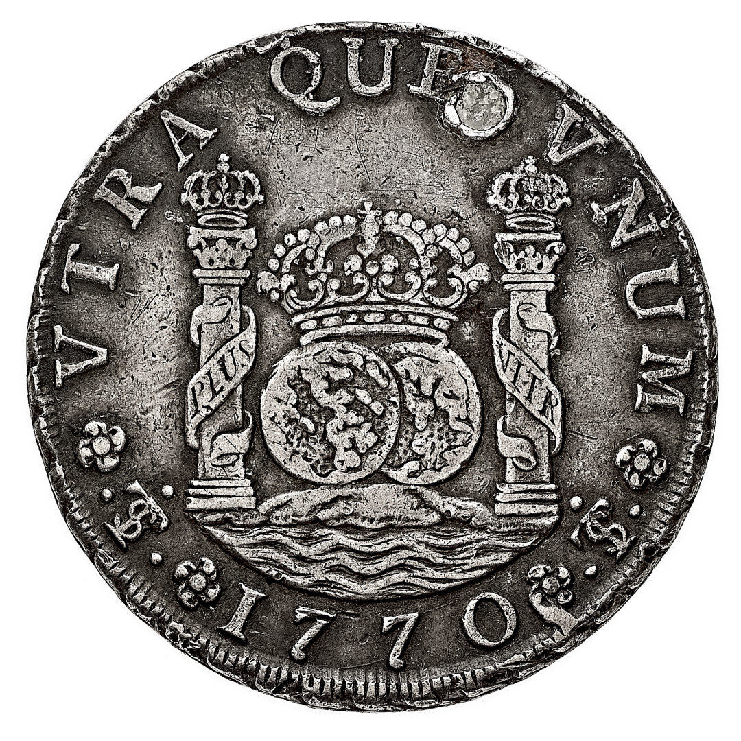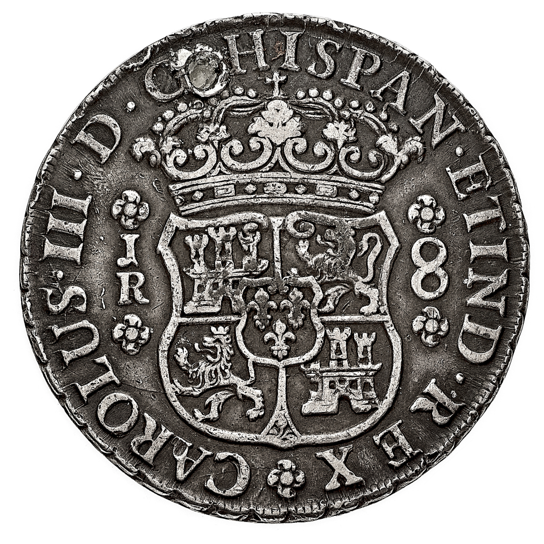 Carlo III (1700-1746) - 8 Reales J-R - Zecca: Potosì - Diritto: stemma coronato - Rovescio: due emisferi affiancati e sovrastati dalla corona fra le colonne d'Ercole - gr. 26,74 - Foro otturato, BB