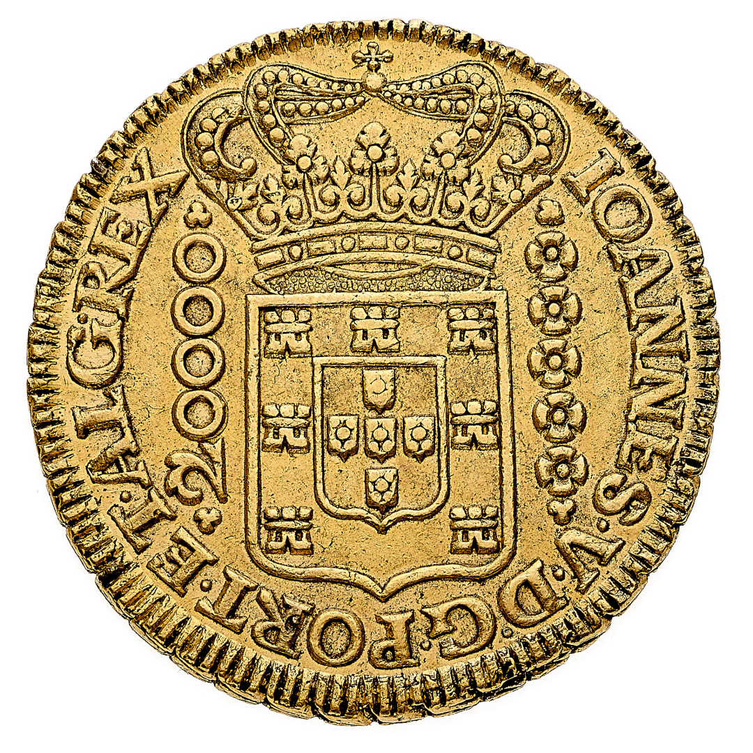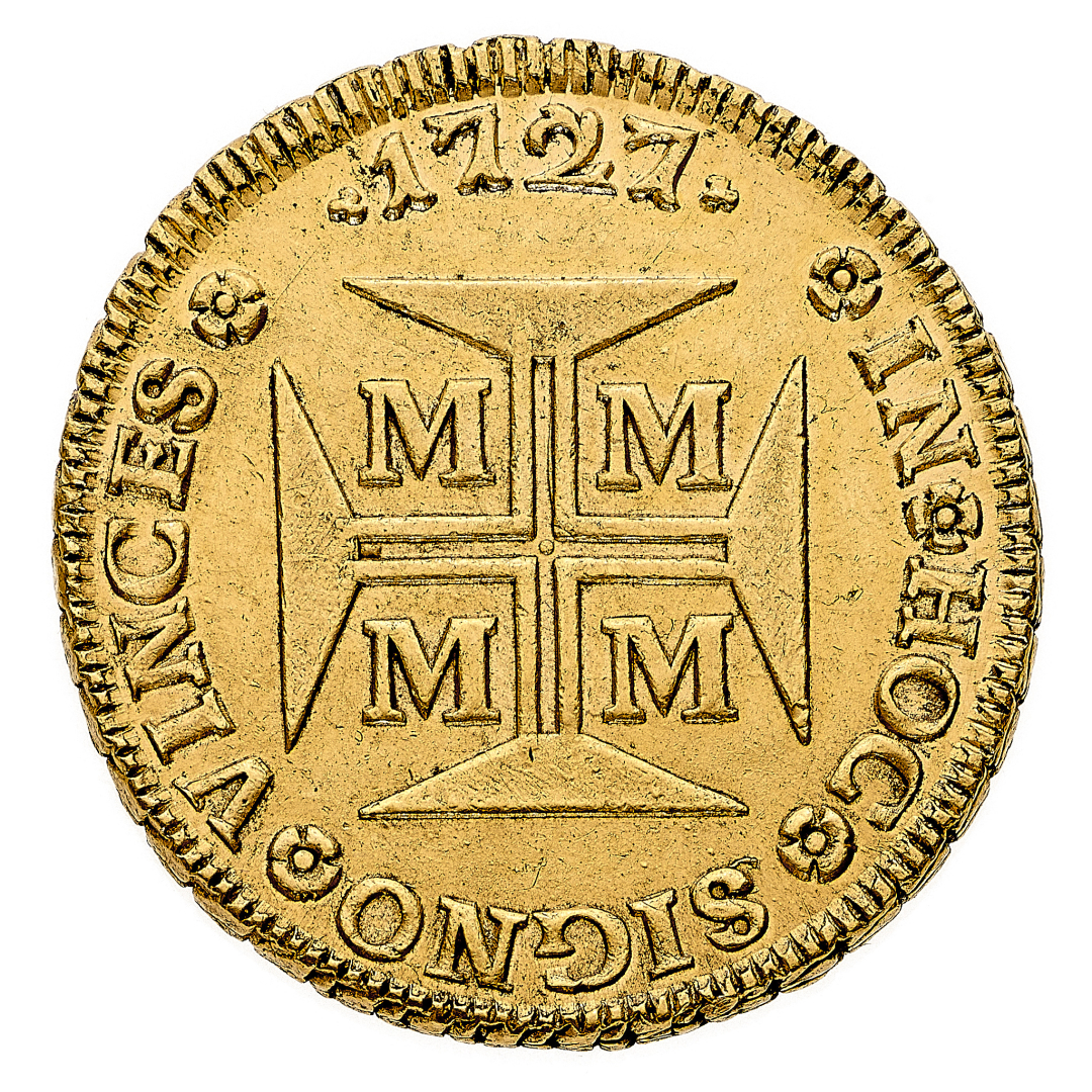 Joao V (1706-1750) - 20.000 Reis 1727 - Zecca: Minas Gerais (Vila Rica) - Diritto: stemma coronato - Rovescio: croce potenziata accantonata da quattro M - gr. 53,77 - Rara - Lievi depositi, SPL