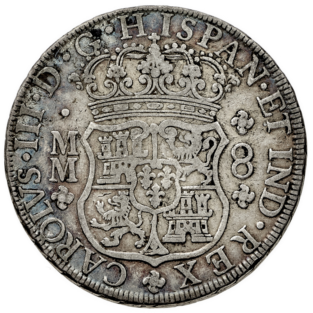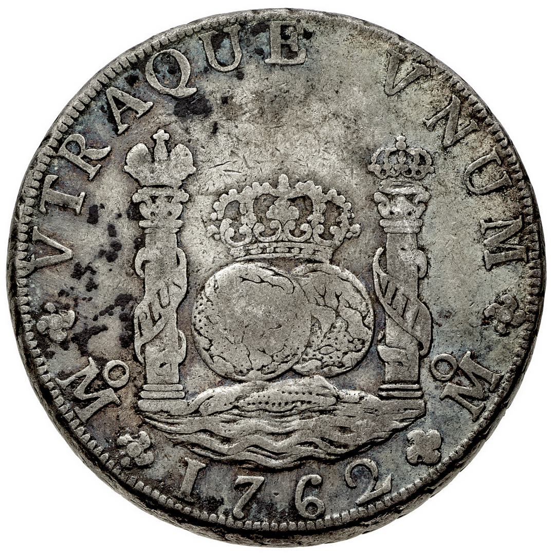 Carlo III (1759-1788) - 8 Reales 1762 - Zecca: Città del Messico - Diritto: stemma coronato - Rovescio: due emisferi affiancati e sovrapposti dalla corona fra le colonne d'Ercole - gr. 26,84 - BB