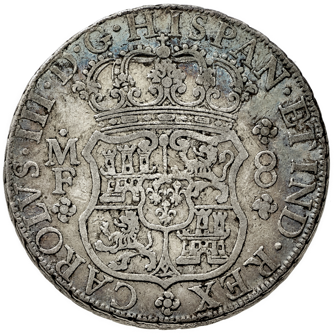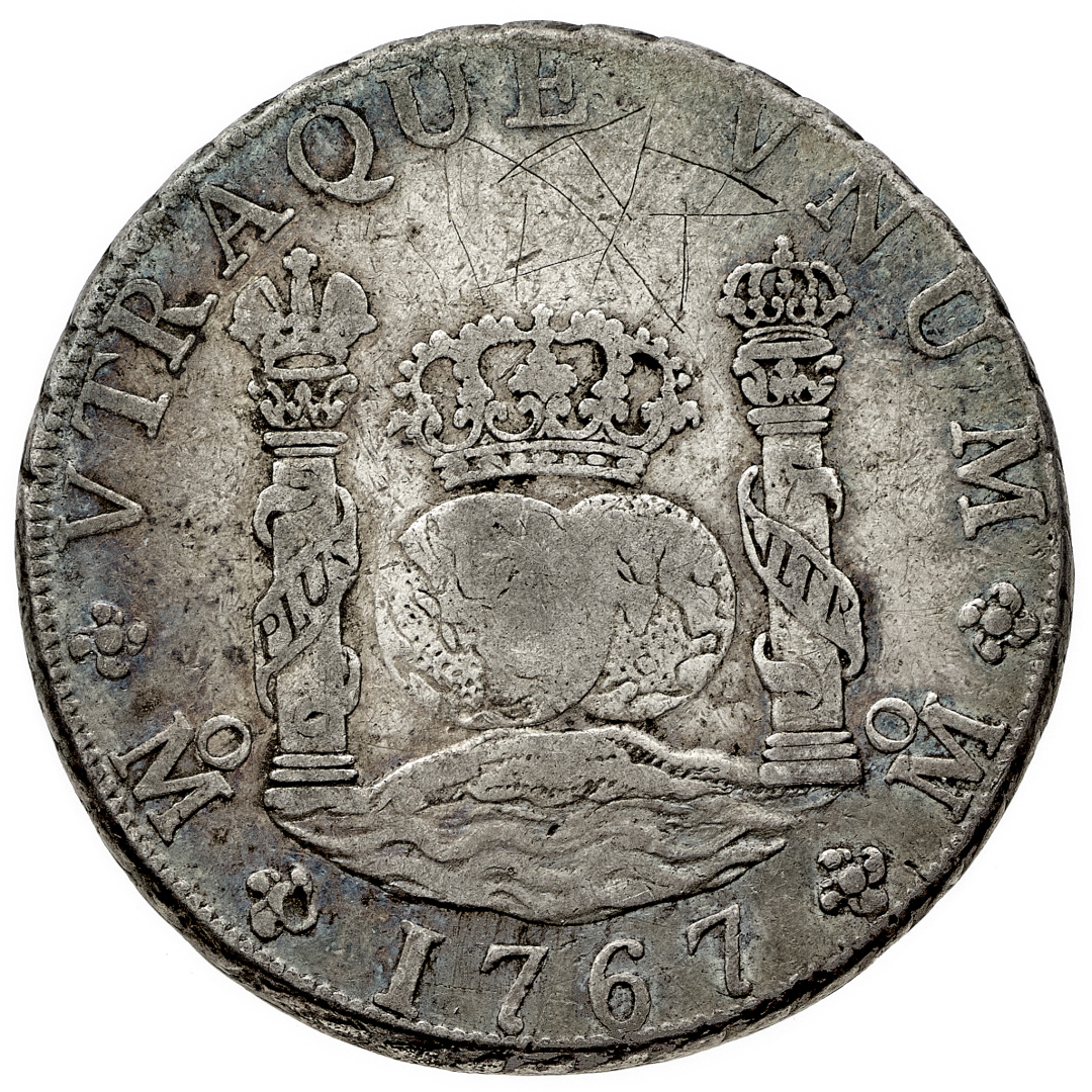 Carlo III (1759-1788) - 8 Reales 1767 - Zecca: Città del Messico - Diritto: stemma coronato - Rovescio: due emisferi affiancati e sovrapposti dalla corona fra le colonne d'Ercole - gr. 26,81 - Graffi al rovescio, q.BB