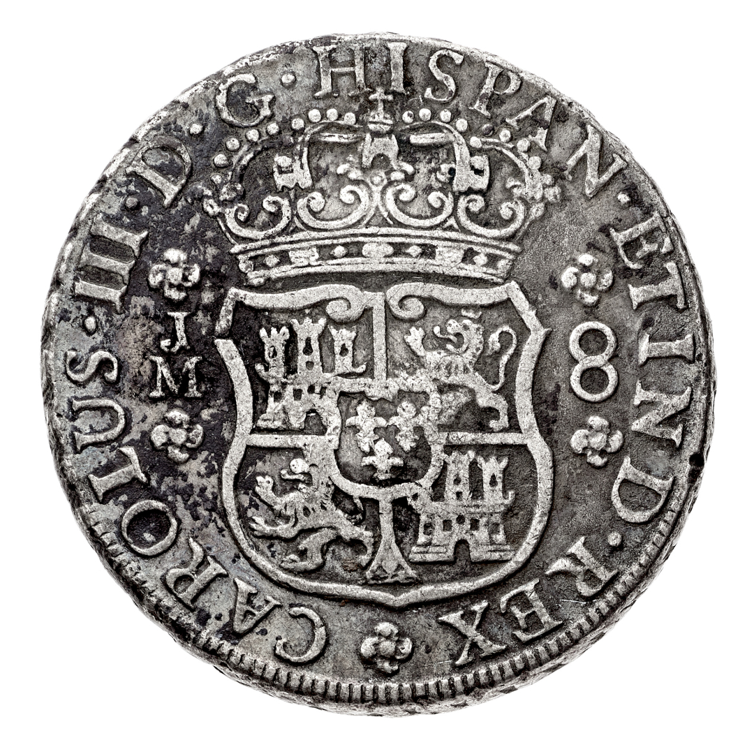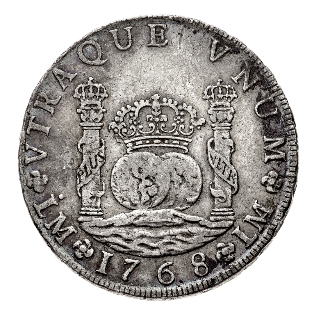 Carlo III (1759-1788) - 8 Reales 1768 - Zecca: Lima - Diritto: stemma coronato - Rovescio: due emisferi affiancati e sovrapposti dalla corona fra le colonne d'Ercole - gr. 26,56 - BB