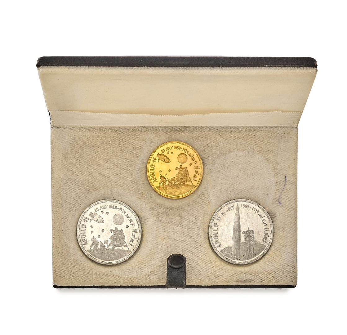 Repubblica (dal 1962) - Serie di 3 valori (n. 2 esemplari da 2 Riyals e n. 1 esemplare da 20 Riyals) 1969 celebrativa del 10° Anniversario dello sbarco sulla Luna - In cofanetto originale con COA n. 750 - q.FDC, cofanetto leggermente danneggiato