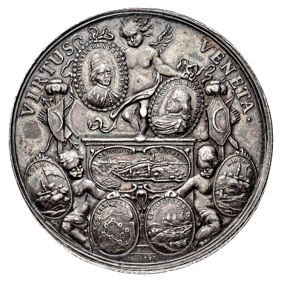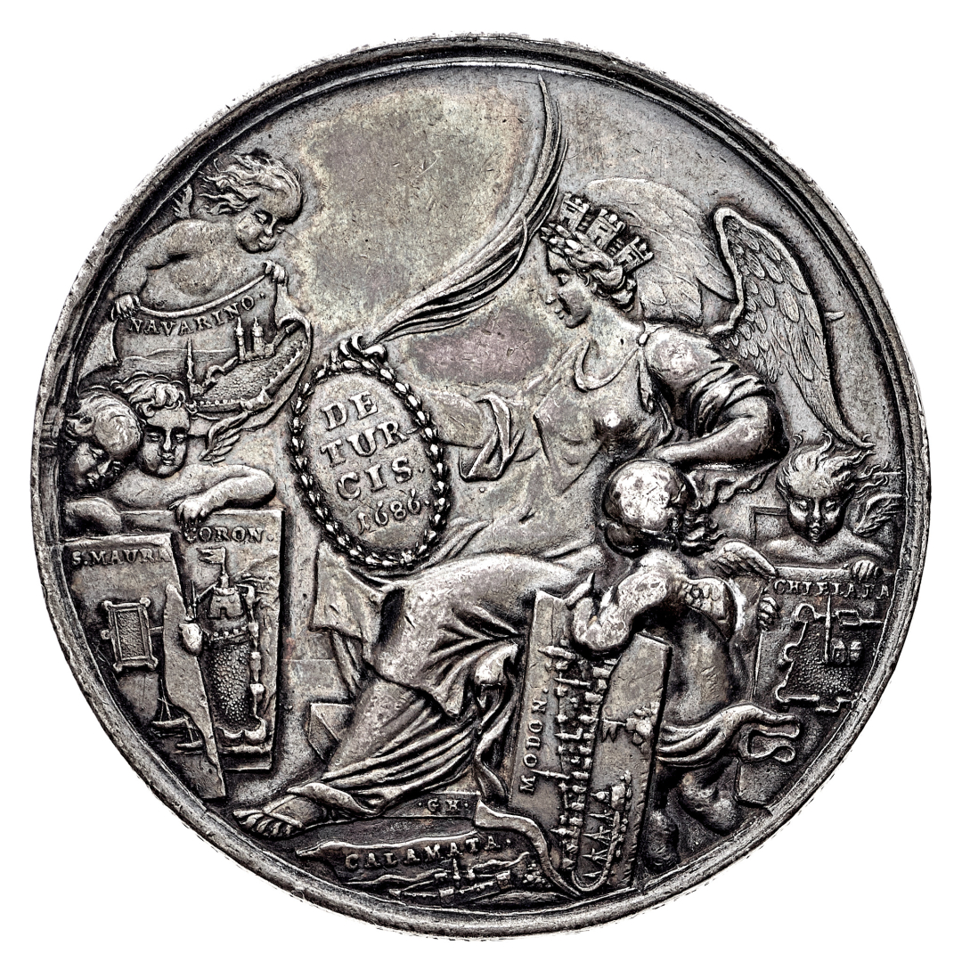 Venezia - Marcantonio Giustinian (1684-1688) - Medaglia 1686 celebrativa delle vittorie in Morea - Opus Georg Hautsch e Lazarus Gottlieb Lauffer - Diametro mm. 42.5 e peso gr. 31.98 - Molto rara - Patina iridescente, q.FDC - Proveniente dall'asta Fritz Rudolf Künker 59, Osnabrück 26-28.9.2000, n. 987