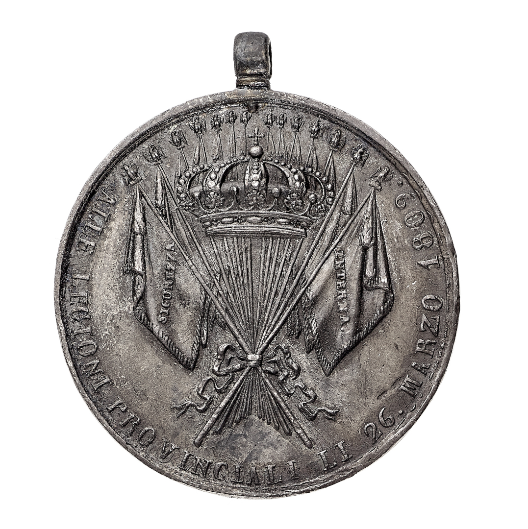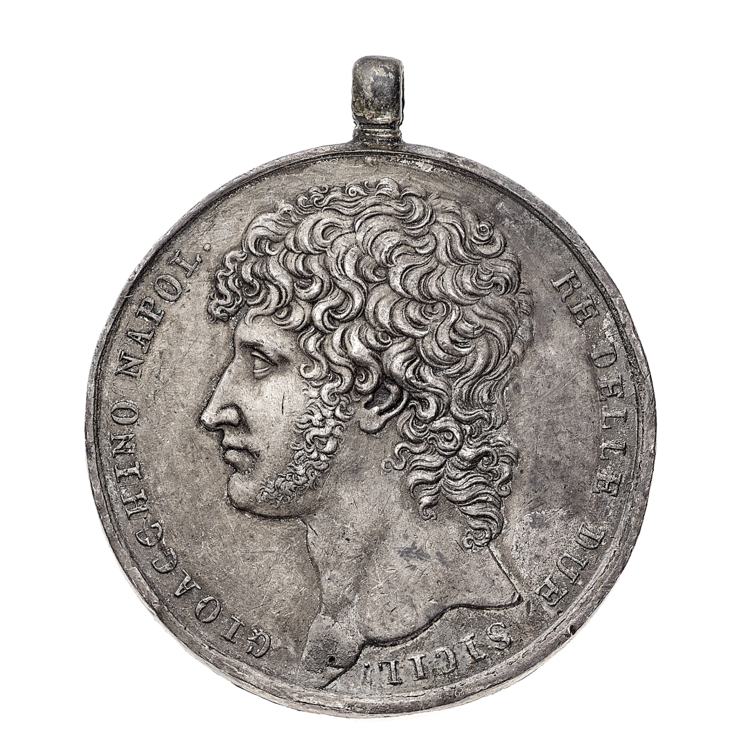 Regno delle Due Sicilie - Gioacchino Murat (1808-1815) - Medaglia 1809 commemorativa della cerimonia di benedizione e distribuzione delle bandiere ai Corpi dell'Esercito e alle Legioni provinciali, con anello di sospensione - Diametro mm. 37 e peso gr. 17,00 - Lievi colpetti, q.SPL