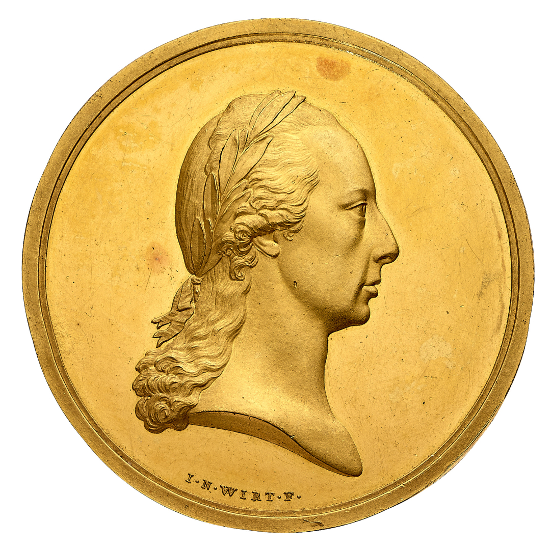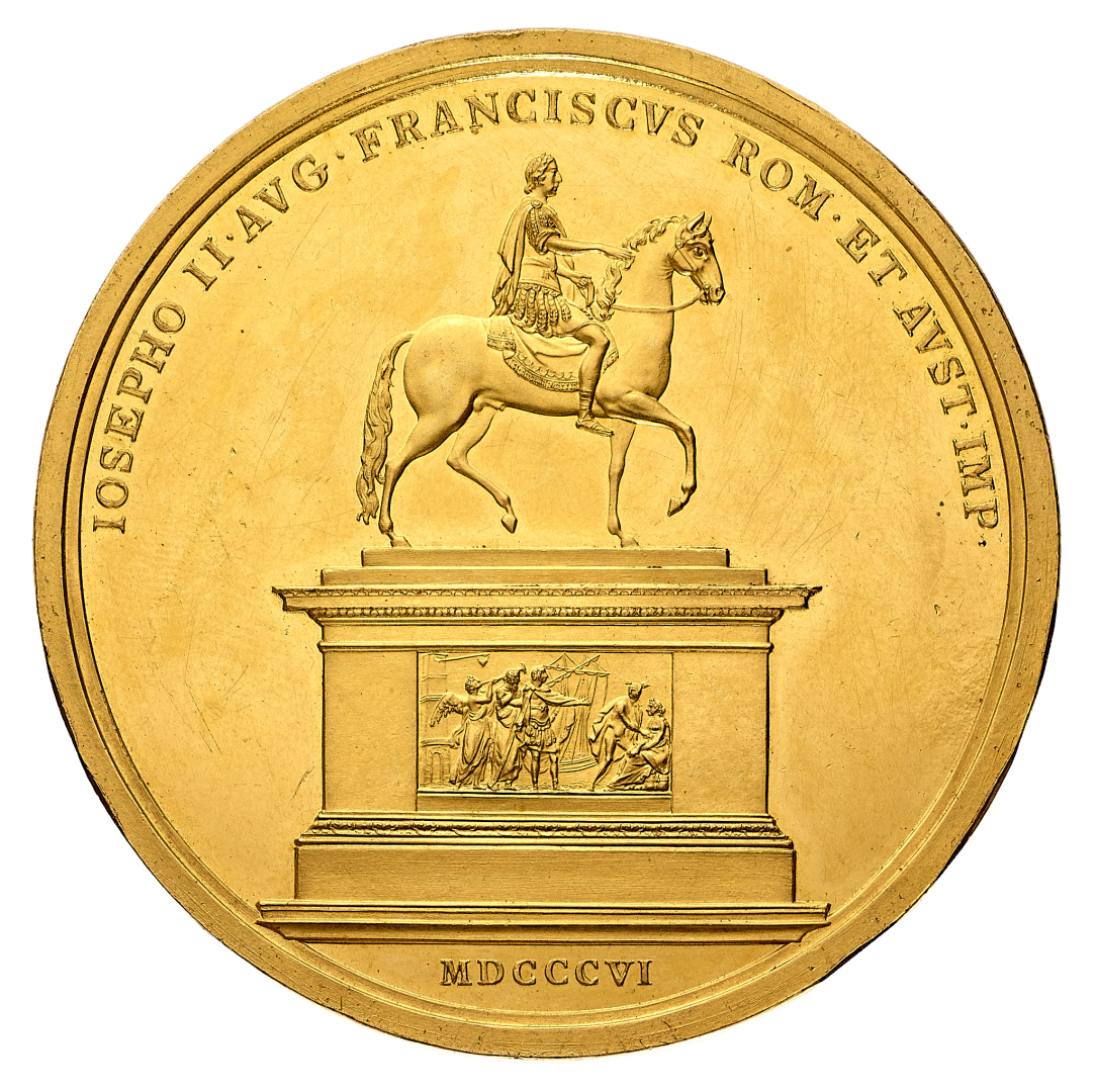 Austria - Franz II (1792-1806) - Medaglia in oro da 20 Ducati per l'inaugurazione del monumento equestre a Giuseppe II - Opus Johann Nepomuk Wirt - Diametro mm. 48 e peso gr. 69,99 - Molto rara - Lieve colpetto al contorno e hairlines, comunque migliore di SPL