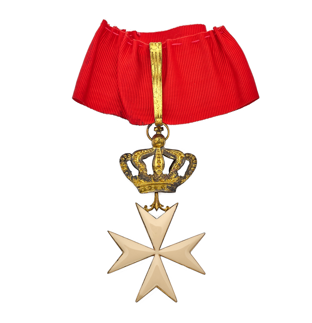 Ordini Internazionali - Malta - Set da Cavaliere di Grazia - Argento dorato e smalti, nastro originale da collo, conservato, insieme alla miniatura e alla decorazione d'asola, nell'astuccio originale di conferimento con marchio del produttore - "1836 JOHNSON MILANO ROMA"