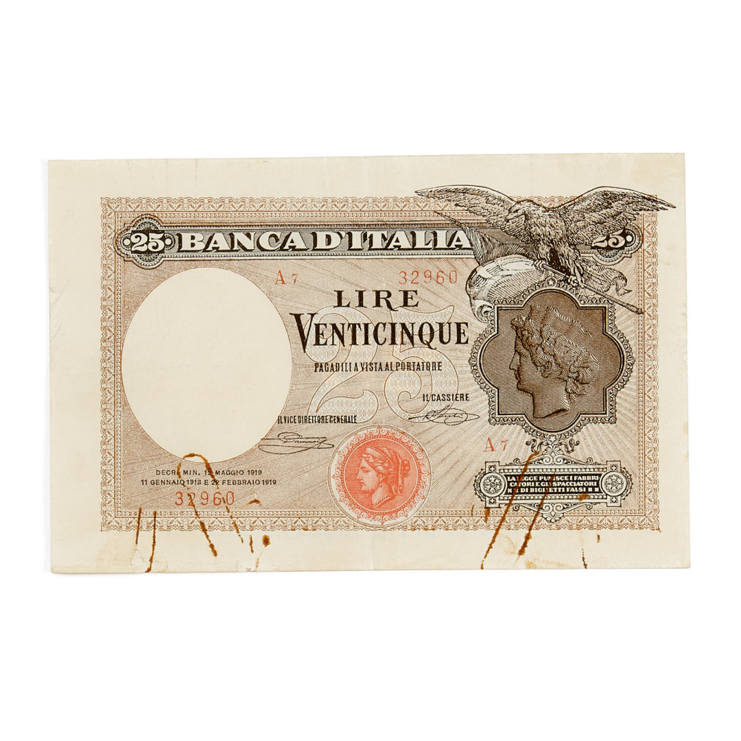 Biglietto di Banca da 25 Lire "Aquila" - D.M. 12.05.1919 - Raro - Tracce di graffetta, lievi strappetti e pieghe, ma biglietto genuino, migliore di BB