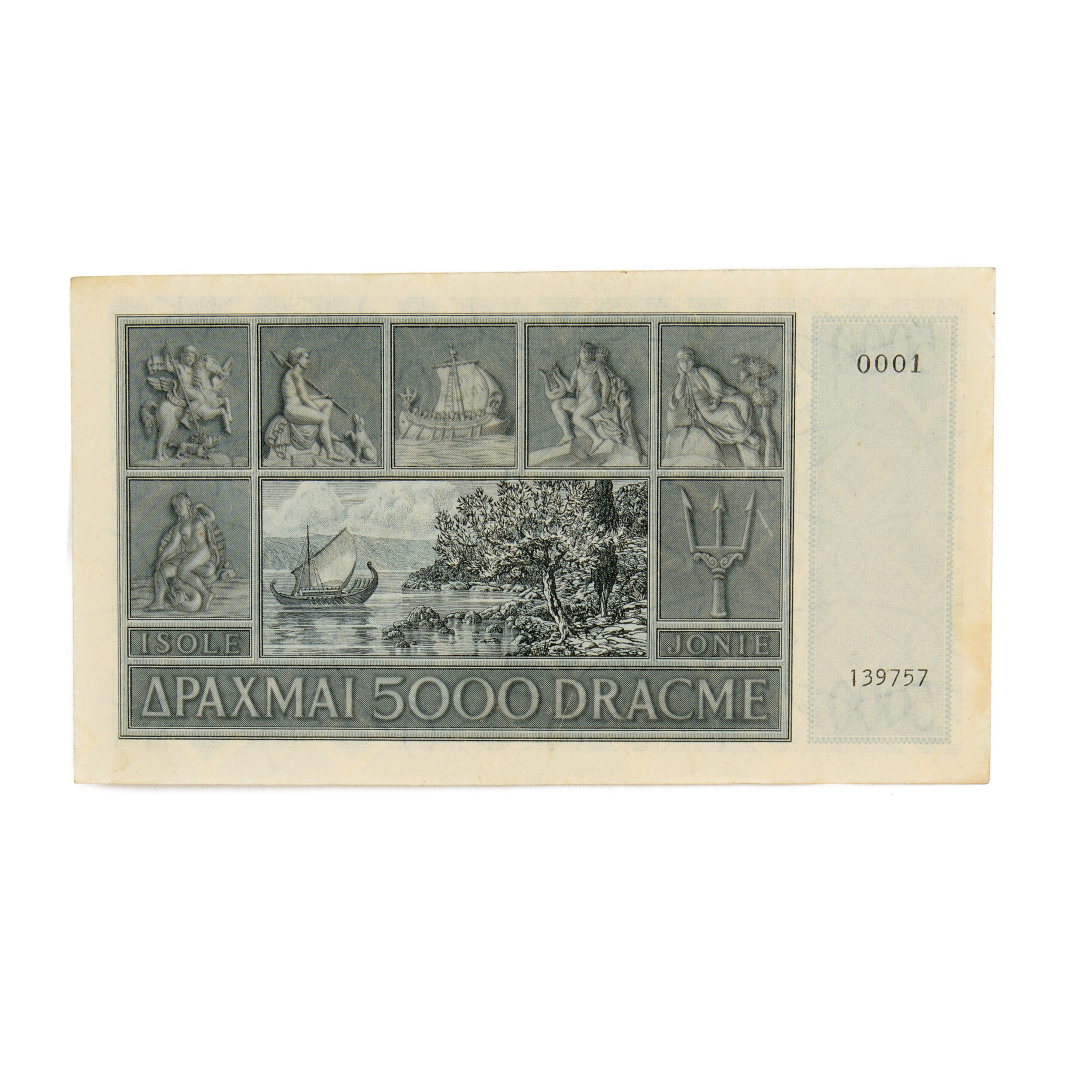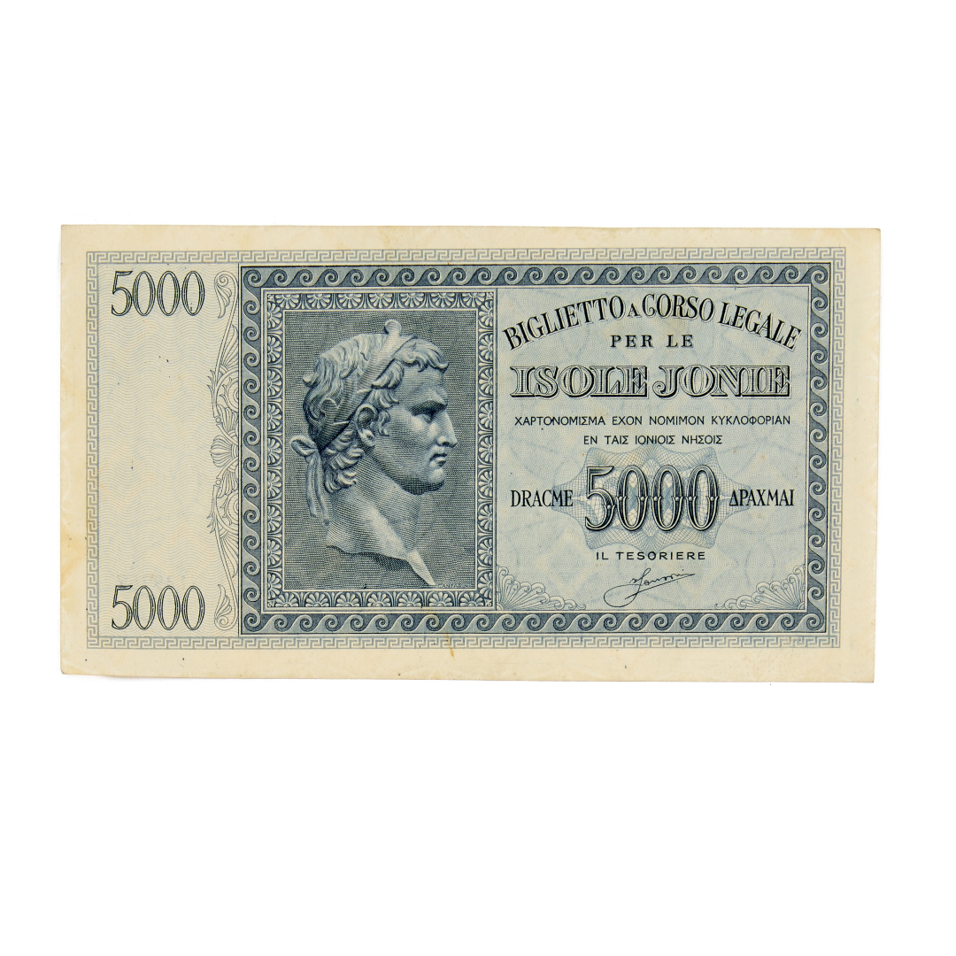 Biglietti a corso legale per le Isole Ionie - Serie di otto valori (1, 5, 10, 50, 100, 500, 1.000 e 5.000 Dracme) 1942 - BB/SPL - Ex collezione Avv. Bruno Segre