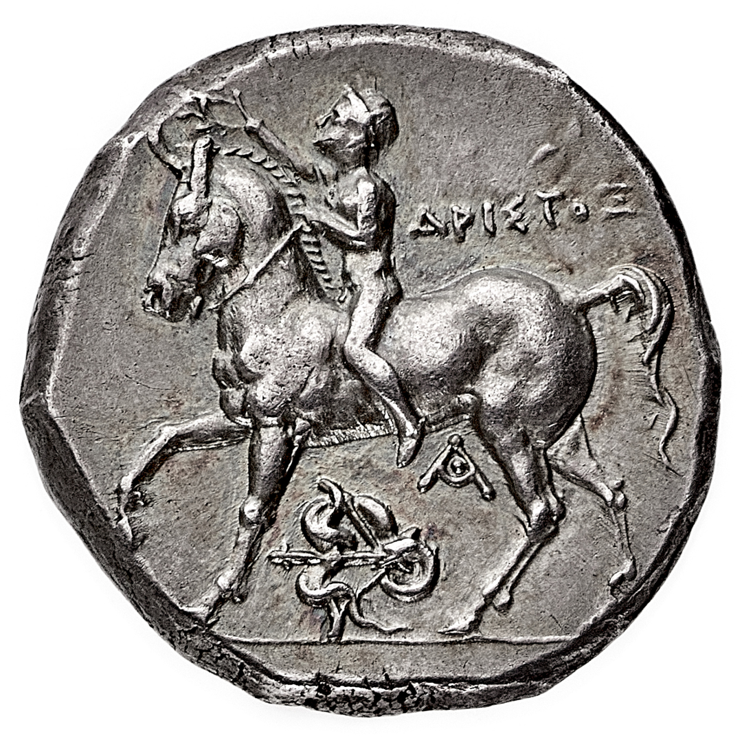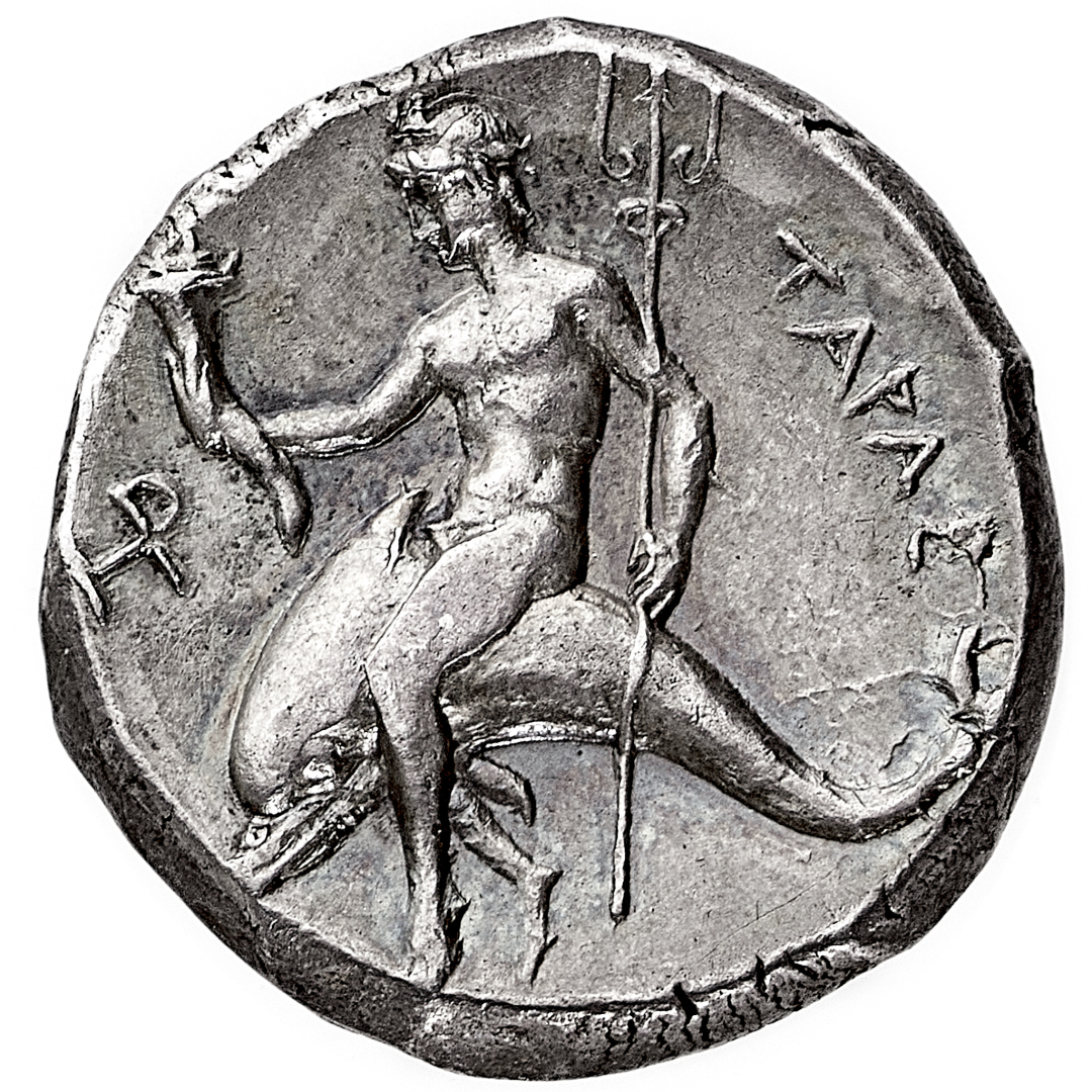 Taranto - Didramma databile al periodo 281-272 a.C. - Diritto: giovane cavaliere incorona il cavallo stante a sinistra; in basso due monogrammi - Rovescio: Taras, in groppa al delfino verso sinistra, tiene una cornucopia con la mano destra e un tridente con la sinistra - gr. 6,60 - Splendida patina di medagliere, migliore di SPL