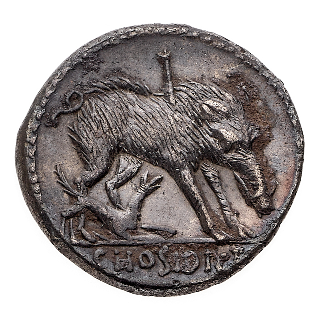Denario al nome C.HOSIDI C.F. GETA databile al 68 a.C. - Zecca: Roma - Diritto: busto drappeggiato di Diana a destra, con arco e frecce sulle spalle - Rovescio: cinghiale a destra ferito da una lancia e attaccato da un segugio - gr. 3,79 - Lievi depositi al rovescio, ma patina iridescente, SPL