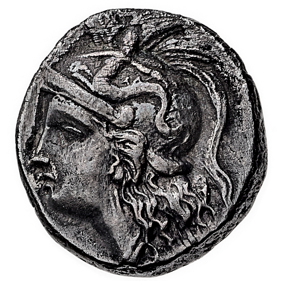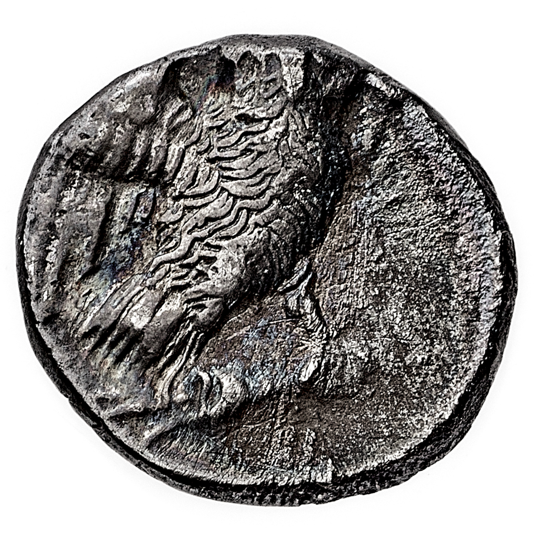 Taranto - Dracma databile al periodo 281-272 a.C. - Diritto: testa di Atena a sinistra con elmo attico crestato e ornato dal mostro Scilla - Rovescio: civetta di fronte ad ali spiegate su fulmine - gr. 3,14 - Non comune - Patina di medagliere, BB