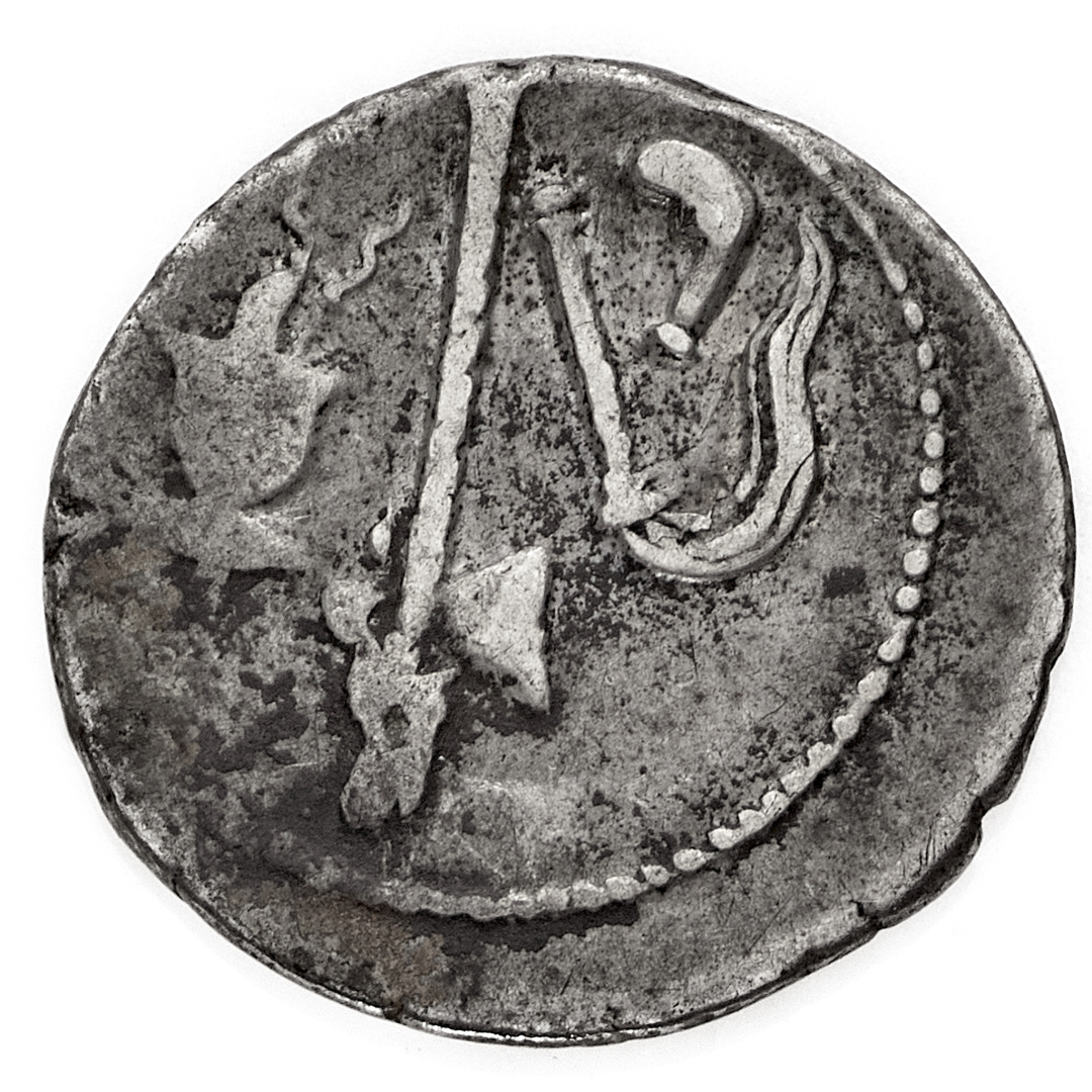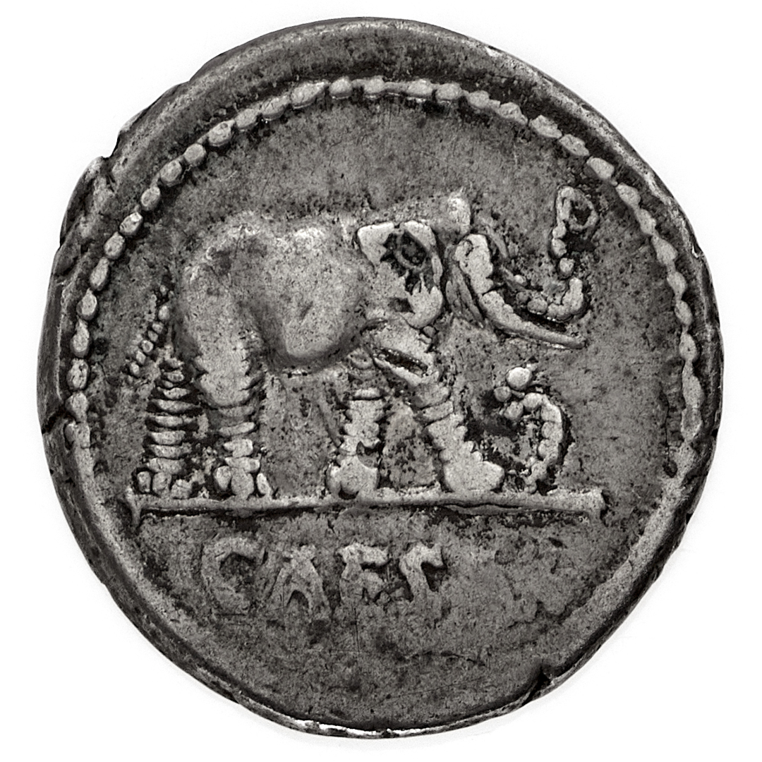 Giulio Cesare - Denario anonimo databile agli anni 49-48 a.C. - Zecca: itinerante al seguito di Giulio Cesare - Diritto: simboli pontificali - Rovescio: elefante in cammino verso destra, calpesta un drago con la zampa anteriore destra - gr. 3,65 - q.BB