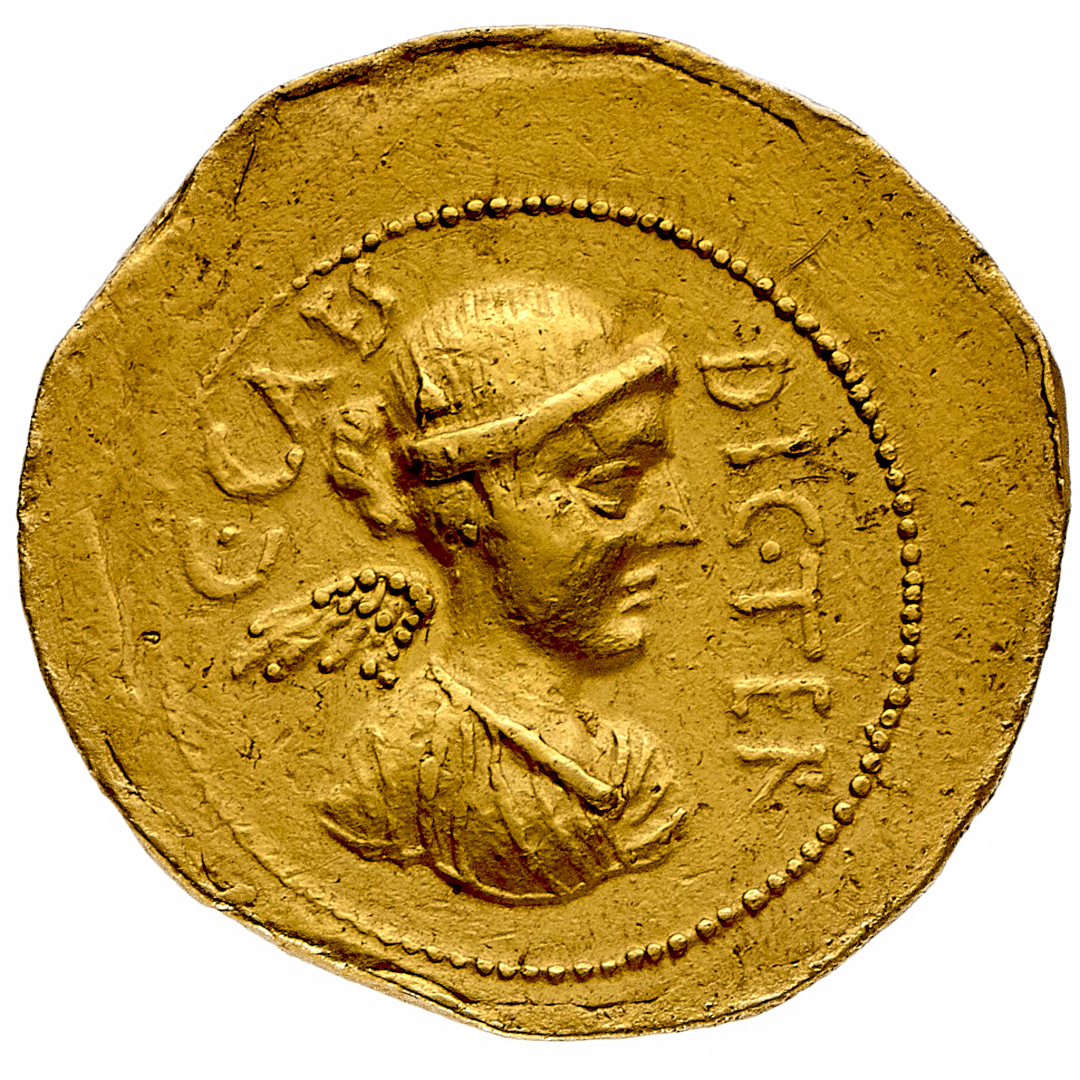 Giulio Cesare - Aureo databile al 45 a.C. NGC Ch VF, Strike 5/5 Surface 3/5 - Zecca: Roma - Diritto: busto alato della Vittoria a destra - Rovescio: brocca - Rara - Insolitamente ben centrata e di inusuale conservazione - Cert. #8585056-001