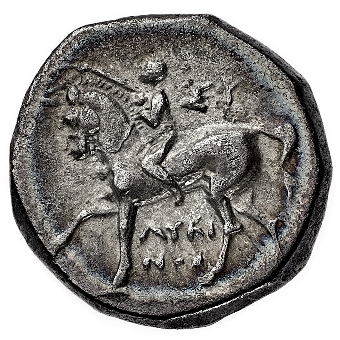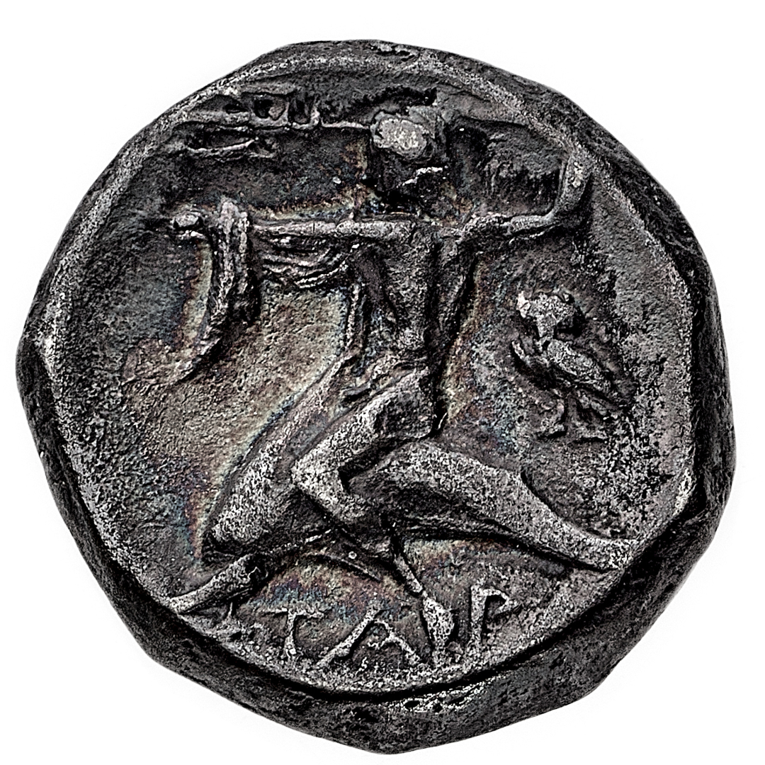 Taranto - Didramma databile al periodo 272-235 a.C. - Diritto: giovane cavaliere incorona il cavallo al passo verso sinistra - Rovescio: Taras, in groppa al delfino verso sinistra, tiene un tridente con la mano destra e la sinistra protesa in avanti; nel campo, a destra, una civetta - gr. 6,32 - Patina iridescente, q.SPL