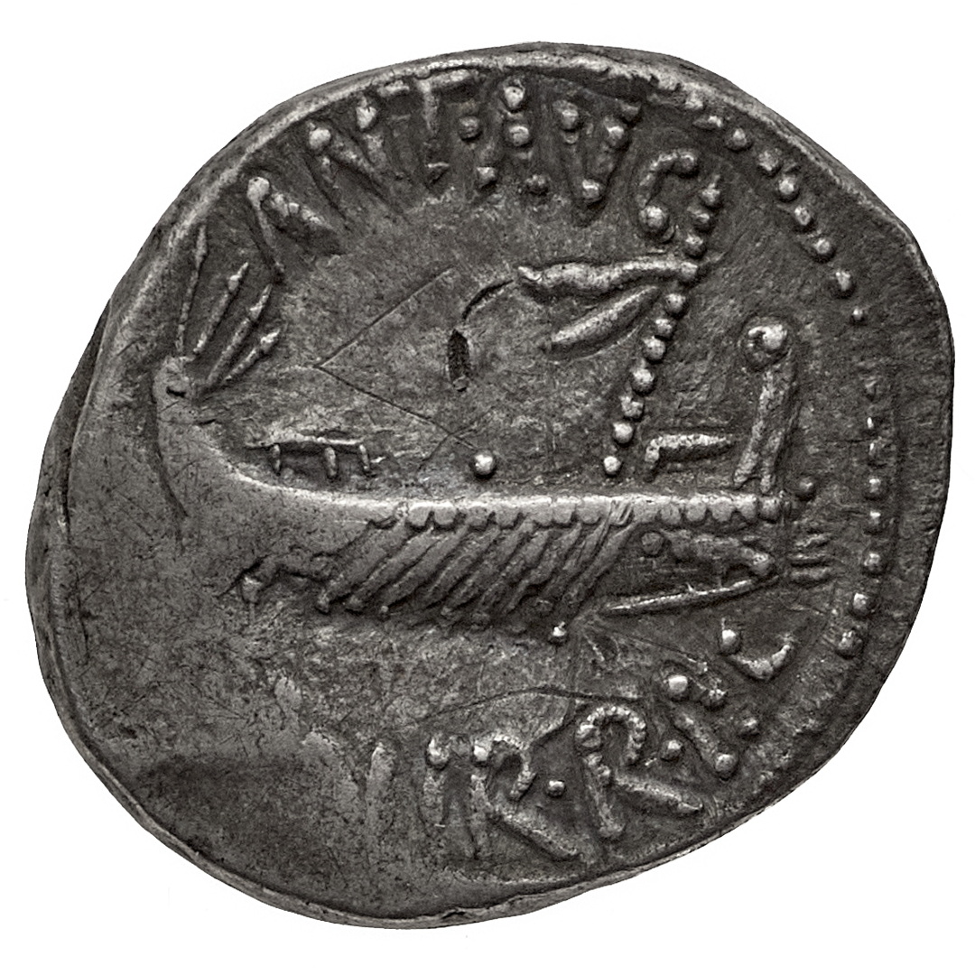 Marco Antonio - Denario Legionario databile agli anni 32-31 a.C., Legio II - Zecca: itinerante al seguito di Marco Antonio - Diritto: nave verso destra - Rovescio: aquila legionaria fra due stendardi - gr. 3,89 - Graffito e contromarca al diritto, BB