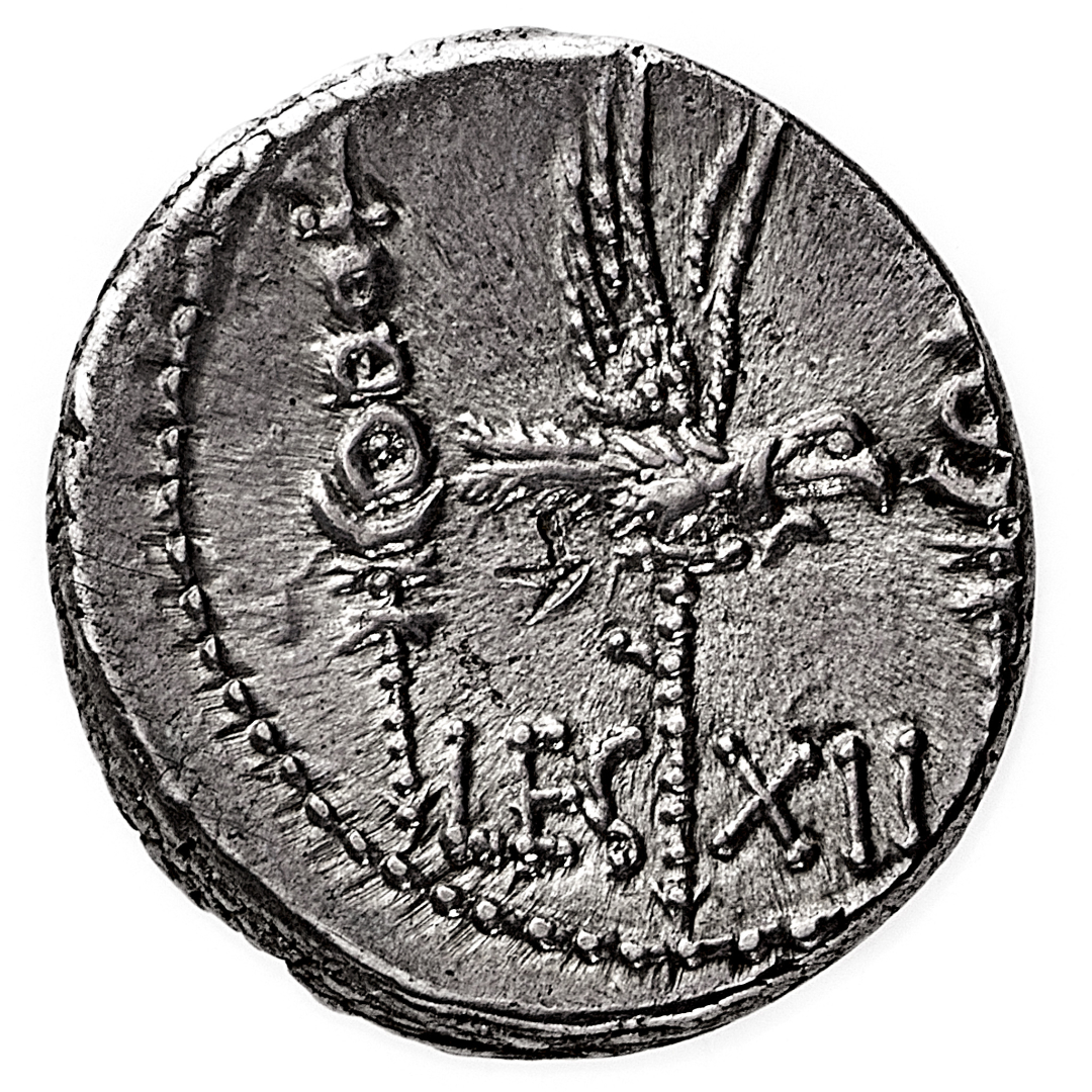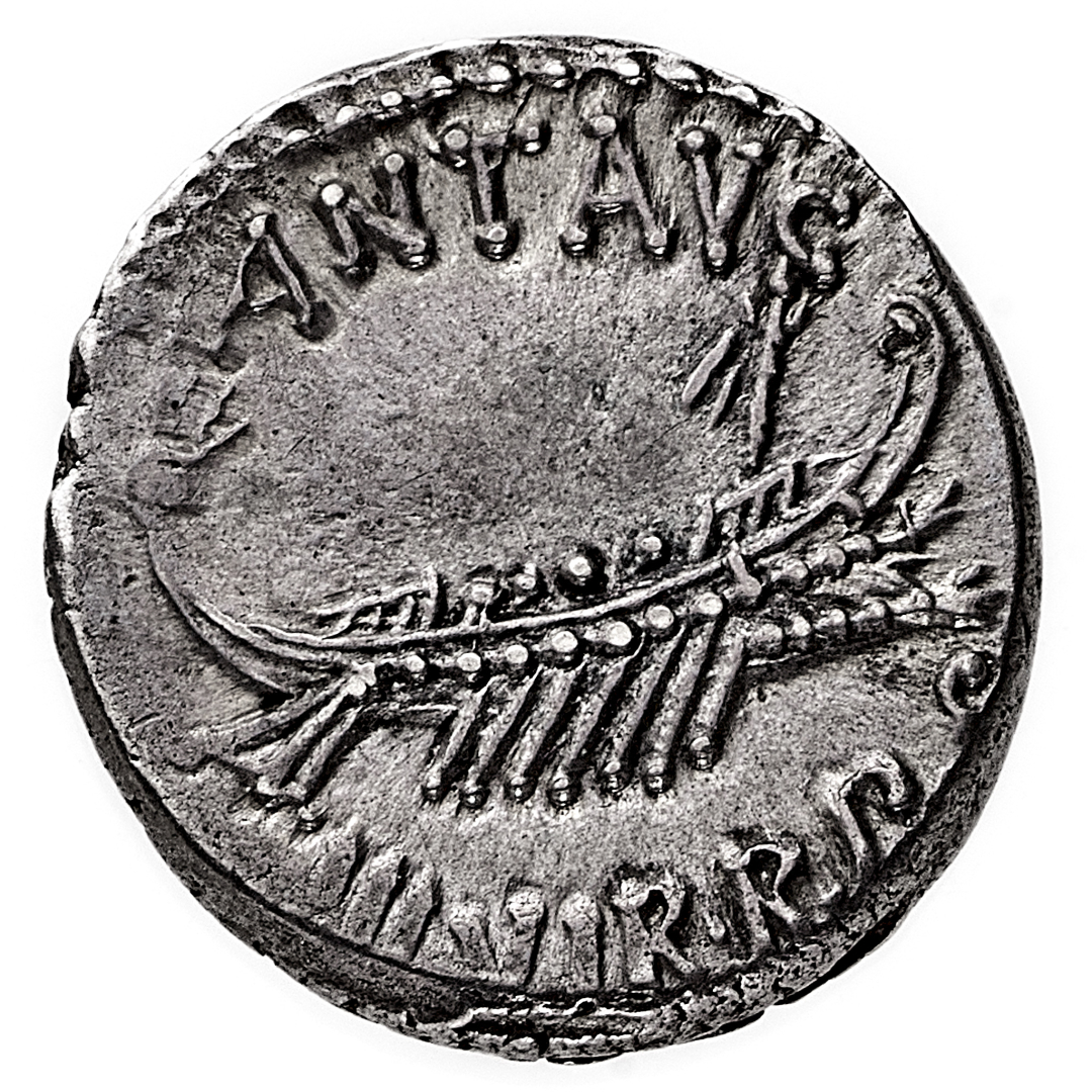 Marco Antonio - Denario Legionario databile agli anni 32-31 a.C., Legio XII - Zecca: itinerante al seguito di Marco Antonio - Diritto: nave verso destra - Rovescio: aquila legionaria fra due stendardi - gr. 3,71 - SPL