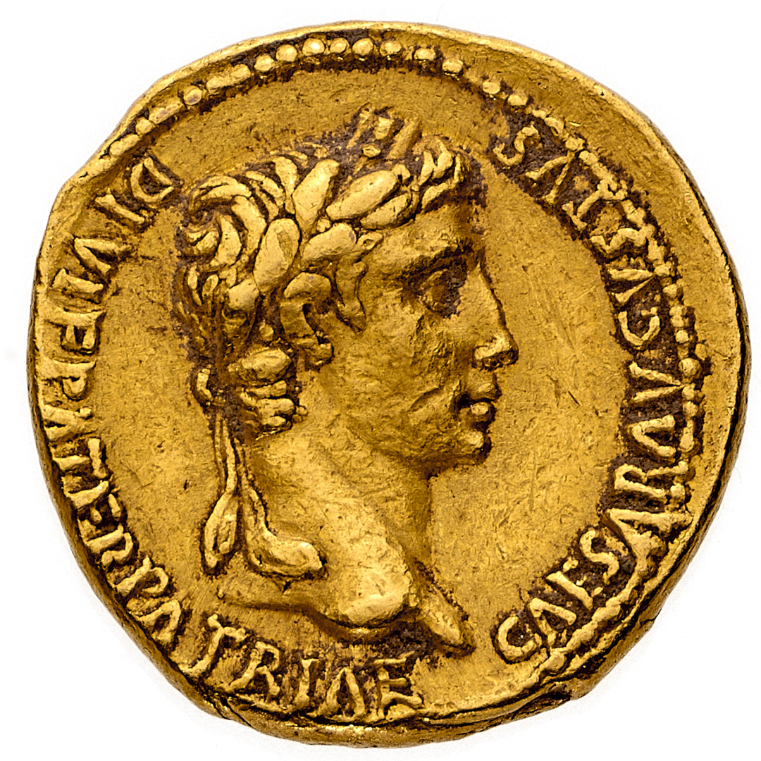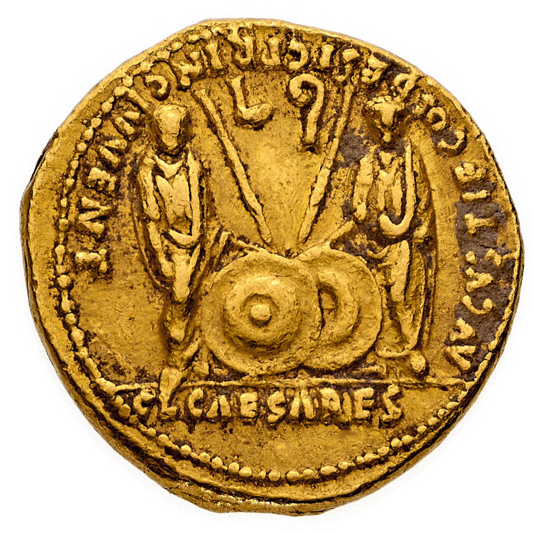 Aureo databile al periodo 2 a.C. - 4 d.C. - Zecca: Lugdunum - Diritto: testa laureata dell'Imperatore a destra - Rovescio: Caio e Lucio, nipoti dell'Imperatore, stanti di fronte in toga, reggono ciascuno uno scudo e una lancia posati a terra, sopra i quali campeggiano il simpulum e il lituus - gr. 7,88 - Lievi depositi, migliore di BB