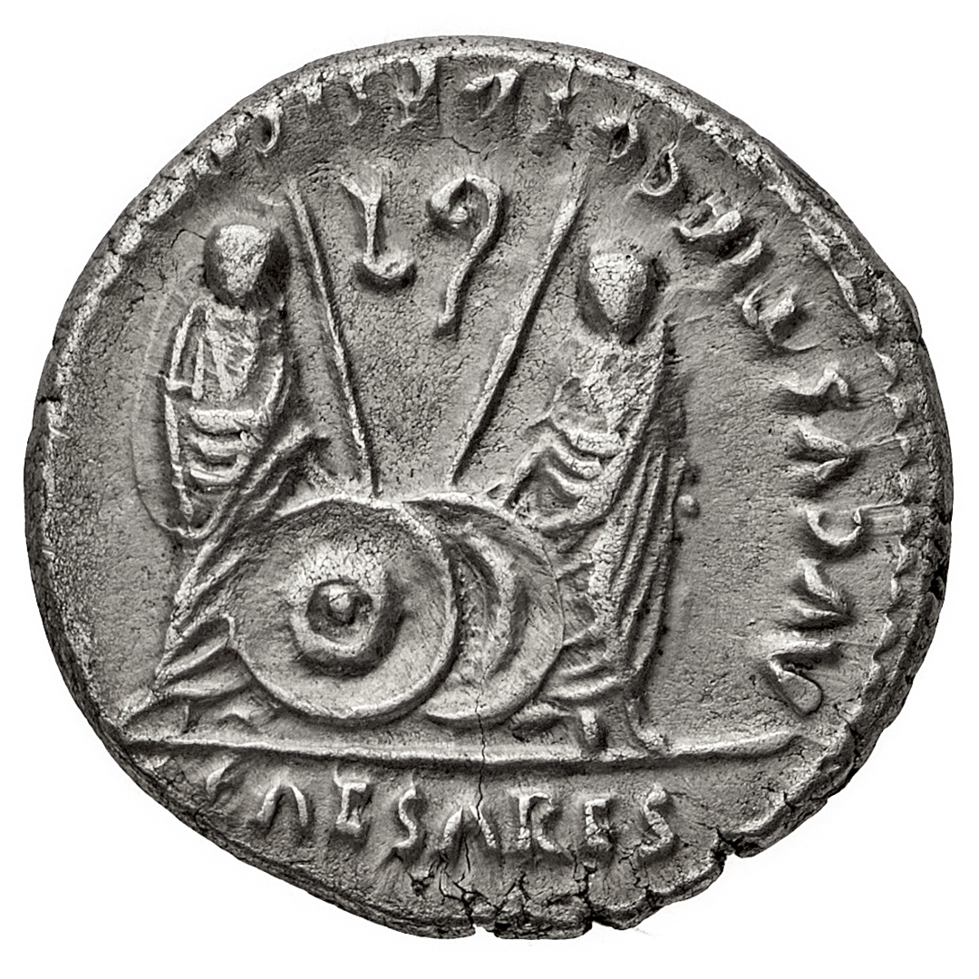 Denario databile al periodo 2 a.C .- 4 d.C. - Zecca: Lugdunum - Diritto: testa laureata dell'Imperatore a destra - Rovescio: Caio e Lucio, nipoti dell'Imperatore, stanti di fronte in toga, reggono ciascuno uno scudo e una lancia posati a terra, sopra i quali campeggiano il lituus e il simpulum - gr. 3,81 - Lieve porosità del metallo, migliore di BB