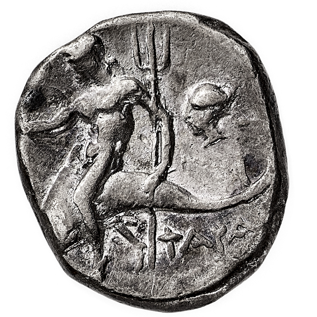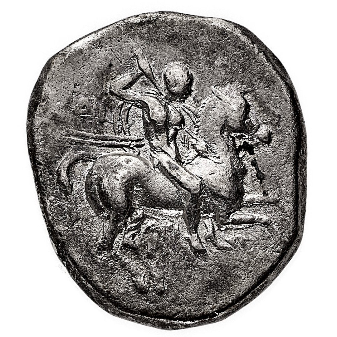 Taranto - Didramma databile al periodo 272-235 a.C. - Diritto: guerriero al galoppo verso destra rivolge verso il basso un giavellotto che brandisce con la mano destra e tiene due lance e uno scudo con la sinistra - Rovescio: Taras, in groppa al delfino verso sinistra, tiene un kantharos con la mano destra e un tridente con la sinistra; nel campo, a destra, una testa di ninfa - gr. 6,31 - Migliore di BB