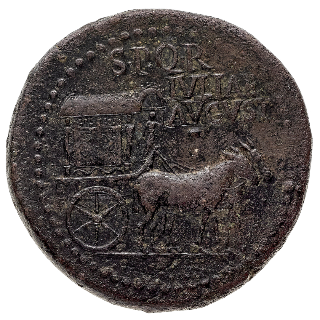 Sesterzio al nome di Livia, madre dell'Imperatore, databile agli anni 22-23 d.C. - Zecca: Roma - Diritto: carpentum trainato da due mule verso destra - Rovescio: lettere S C - gr. 28,13 - Rara - Lievi difetti del metallo, BB