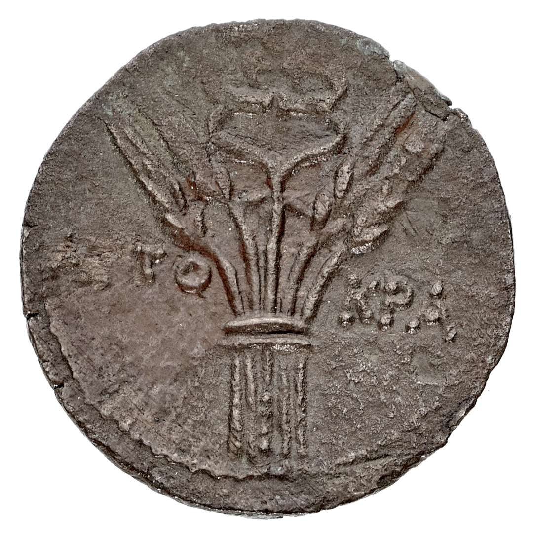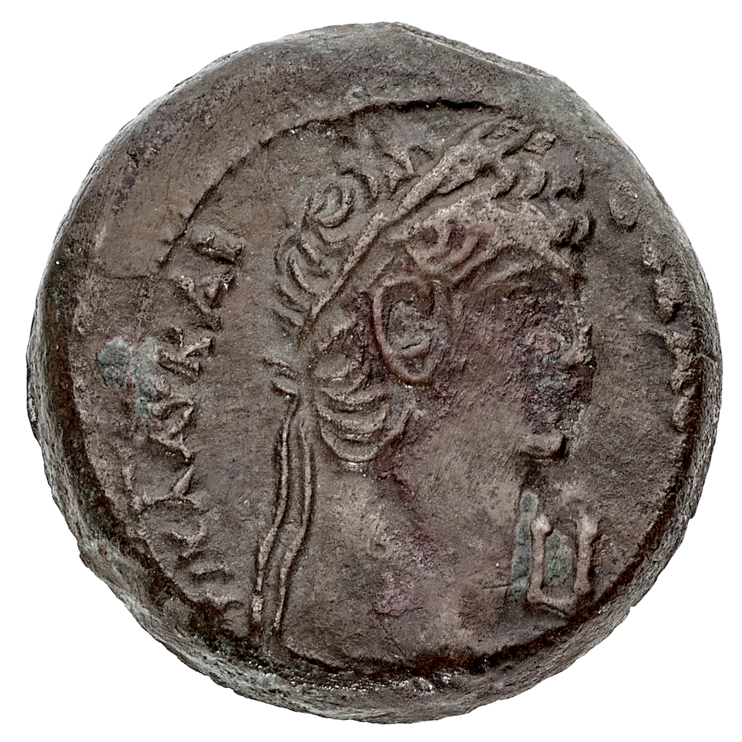 Diobolo - Zecca: Alessandria d'Egitto - Diritto: testa laureata dell'Imperatore a destra - Rovescio: quattro spighe di grano con al centro un caduceo - gr. 9,00 - q.SPL - Corredata dal cartellino di Oscar Rinaldi