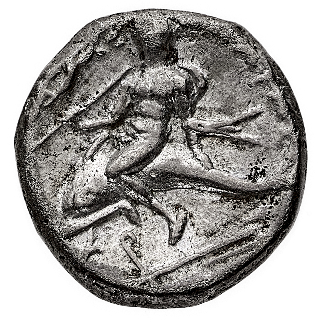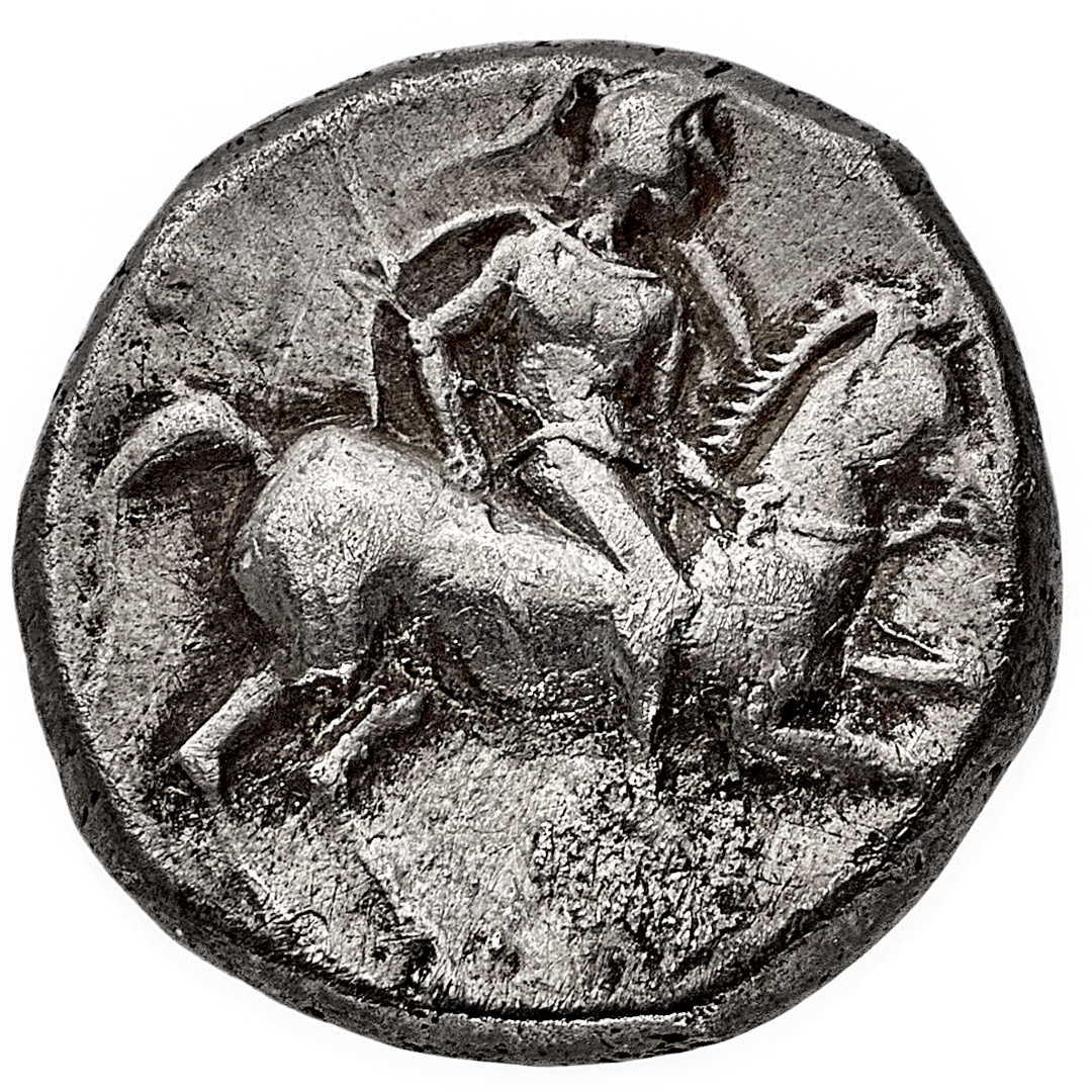 Taranto - Didramma databile al periodo 272-235 a.C. - Diritto: guerriero al galoppo verso destra rivolge verso il basso un giavellotto che brandisce con la mano destra e tiene uno scudo con la sinistra - Rovescio: Taras, in groppa al delfino verso sinistra, tiene un tridente con la mano destra e una clamide con la sinistra; in alto la Vittoria in volo verso destra, sotto un timone - gr. 6,48 - Migliore di BB