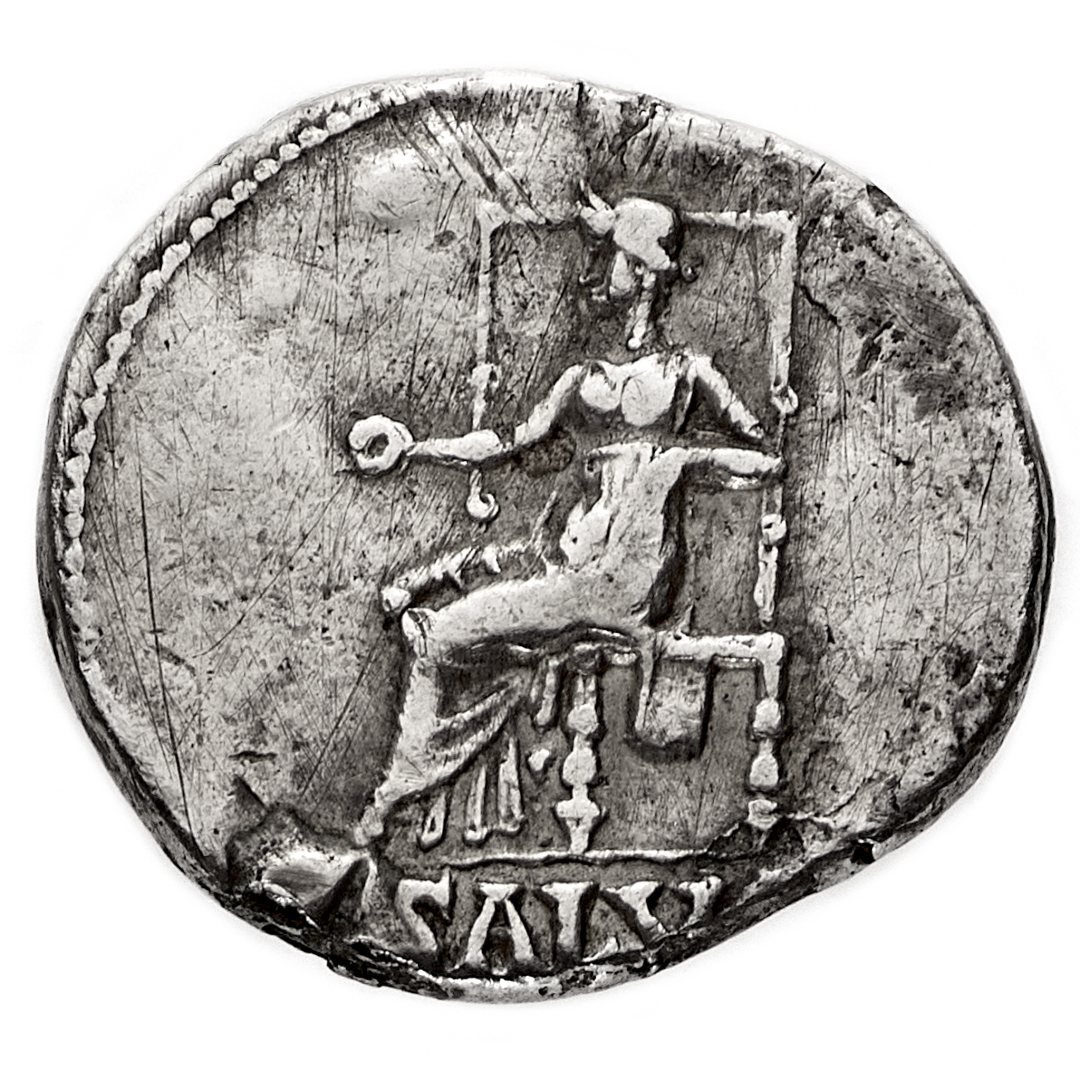 Denario databile al periodo 65-66 d.C. - Zecca: Roma - Diritto: testa laureata dell'Imperatore a destra - Rovescio: la Salus seduta a sinistra tiene una patera con la mano destra - gr. 3,07 - BB