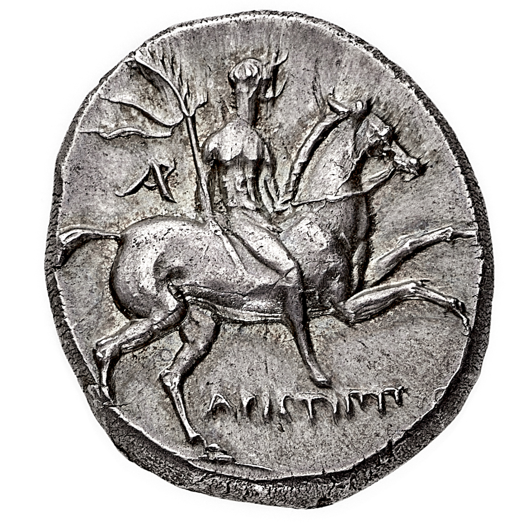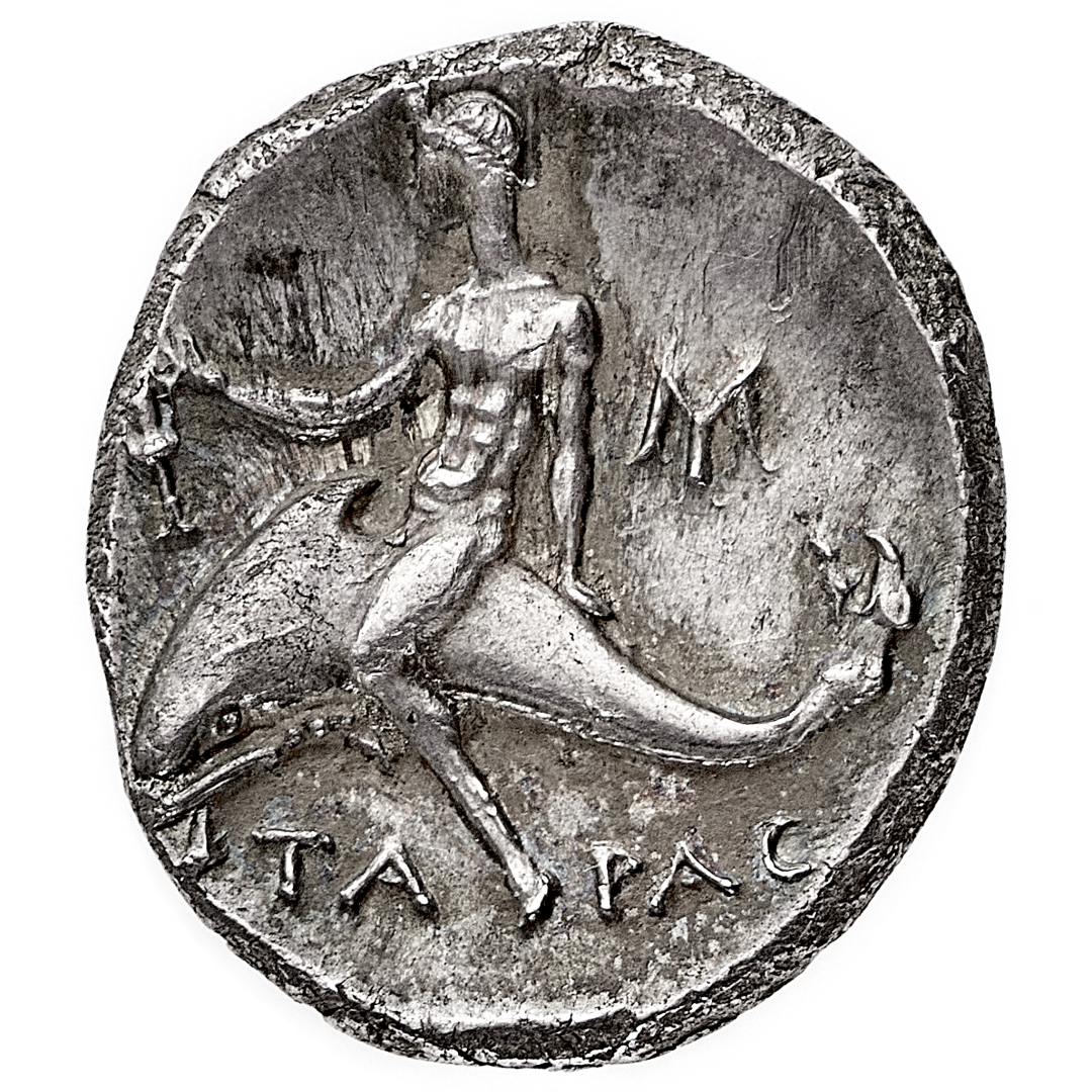 Taranto - Didramma databile al periodo 235-228 a.C. - Diritto: guerriero al galoppo verso destra tiene un ramo di palma con la mano destra - Rovescio: Taras, in groppa al delfino verso sinistra, tiene un kantharos con la mano destra; nel campo a sinistra un monogramma - gr. 6,58 - Migliore di SPL