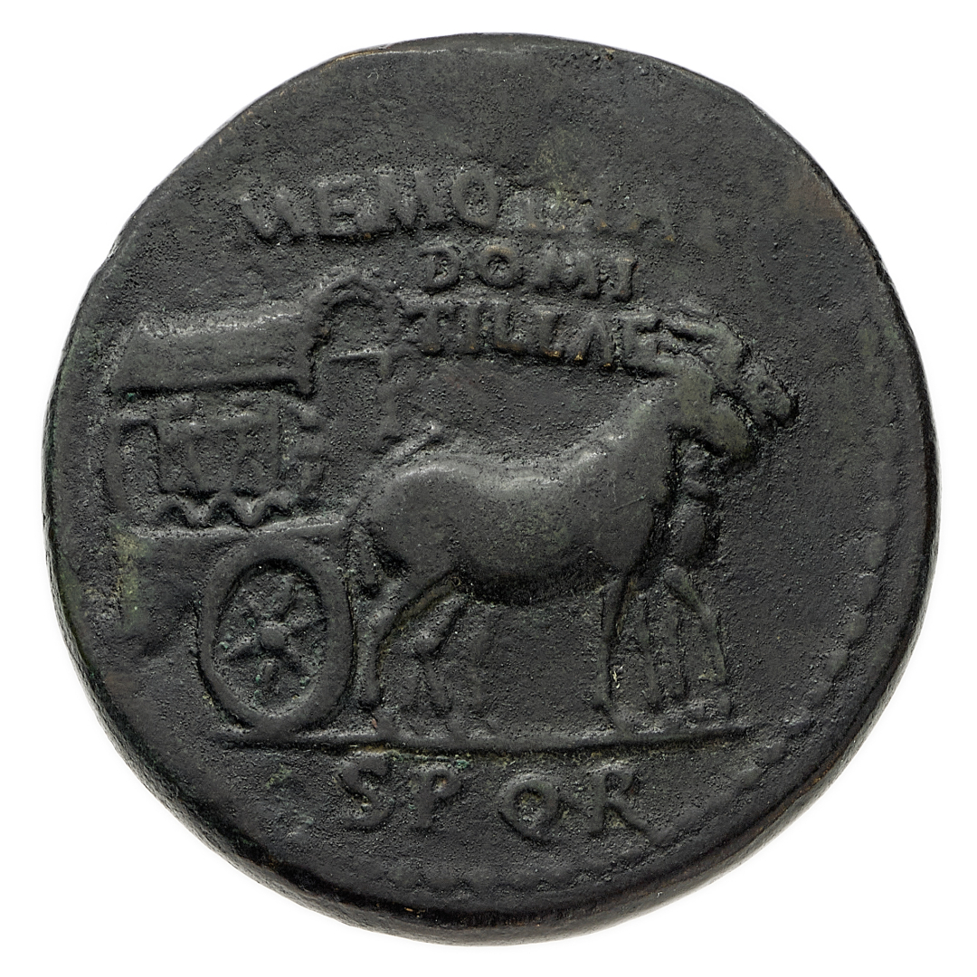 Sesterzio commemorativo al nome di Domitilla, madre dell'Imperatore, databile agli anni 80-81 d.C. - Zecca: Roma - Diritto: carpentum trainato da due mule verso destra - Rovescio: lettere S C - gr. 20,69 - Rara - q.BB - Proveniente dall'asta Nomisma 35, San Marino 16.10.2007, n. 295