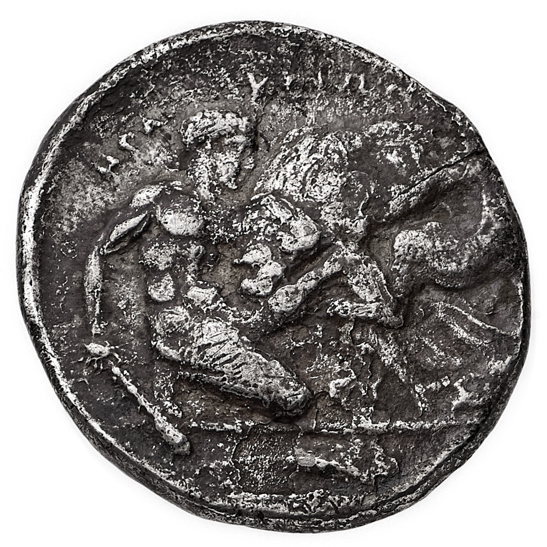 Heraclea - Statere databile al periodo 420-390 a.C. - Diritto: testa di Atena a destra con elmo attico crestato e decorato da un grifone in volo - Rovescio: Eracle semi-inginocchiato a destra combatte con il leone tenendo una clava con la mano destra - gr. 7,64 - Non comune - Metallo poroso, altrimenti BB - Proveniente dall'asta Bolaffi 24, Torino 5-6.6.2014, n. 10