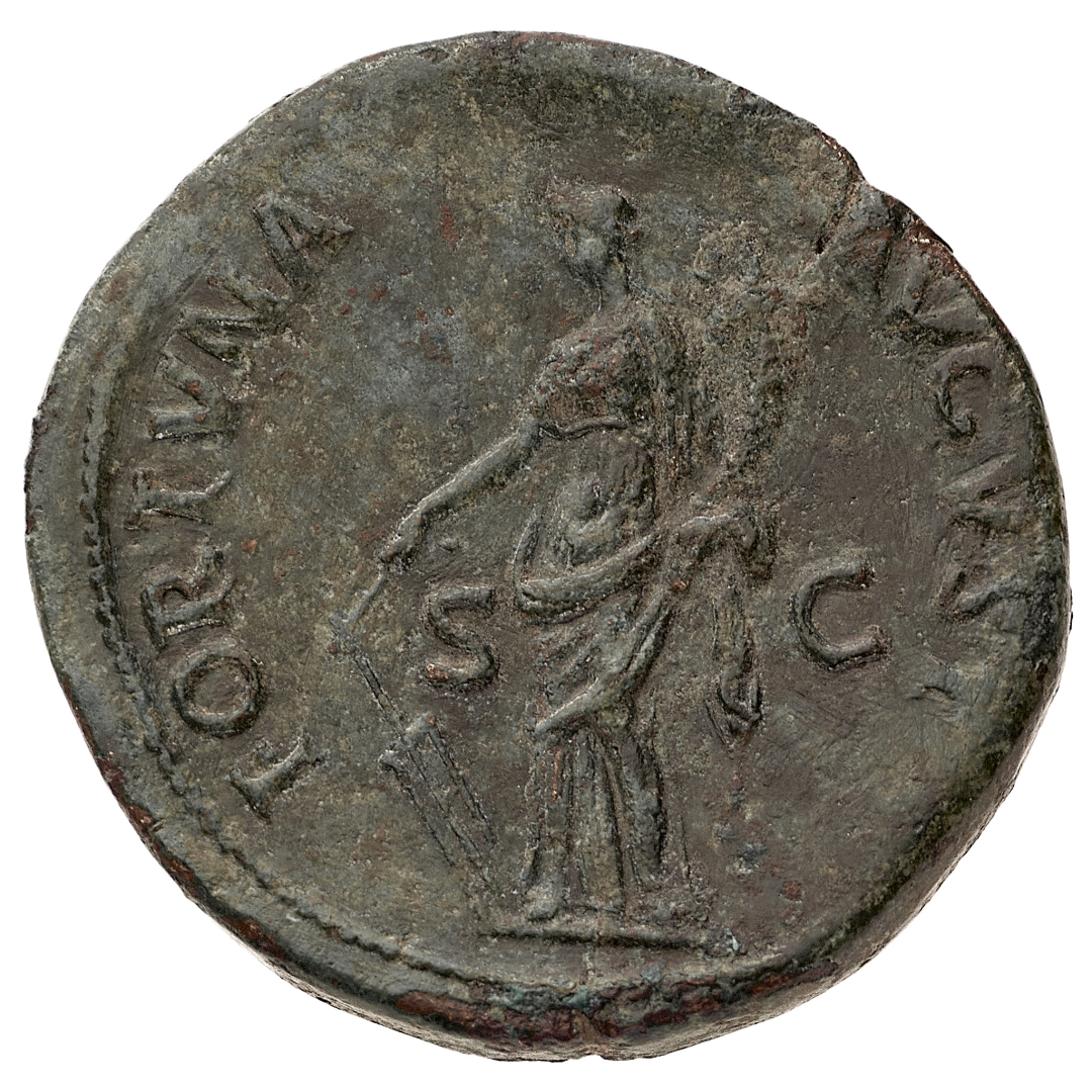 Sesterzio databile al 97 d.C. - Zecca: Roma - Diritto: testa laureata dell'Imperatore a destra - Rovescio: la Fortuna stante a sinistra tiene un timone di nave con la mano destra e una cornucopia con la sinistra - gr. 25,56 - Lievi ritocchi, patina verde, migliore di BB - Proveniente dall'asta Jean Elsen 128, Bruxelles 12.3.2016, n. 167