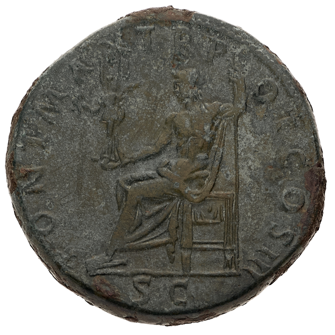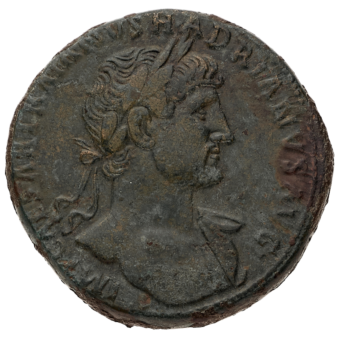 Sesterzio databile al 119 d.C. - Zecca: Roma - Diritto: busto laureato dell'Imperatore a destra con un accenno di drappeggio sulla spalla sinistra - Rovescio: Giove seduto a sinistra tiene una Vittoria con la mano destra e uno scettro con la sinistra - gr. 29,78 - Patina verde, migliore di BB