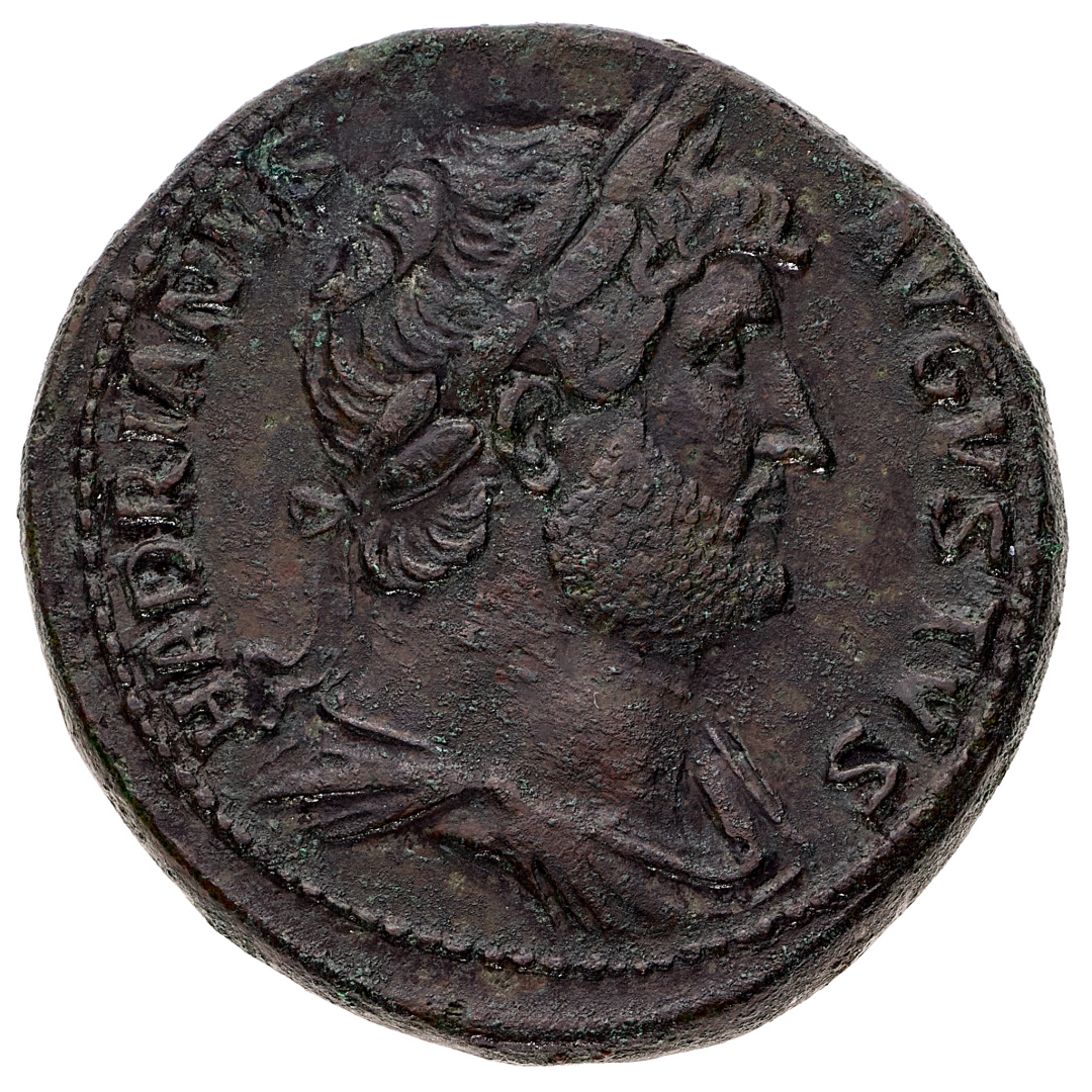 Sesterzio databile al periodo 125-128 d.C. - Zecca: Roma - Diritto: busto laureato e drappeggiato dell'Imperatore a destra - Rovescio: Roma seduta su una corazza, tiene una piccola Vittoria con la mano destra e una cornucopia con la sinistra - gr. 26,23 - Lievi ritocchi, migliore di BB
