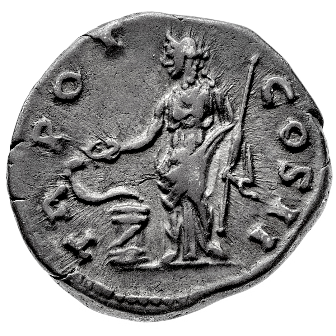 Denaro - Zecca: Roma - Diritto: testa di Elio a destra - Rovescio: la Salus stante a sinistra tiene un lungo scettro verticale con la mano sinistra e, con la destra, una patera, con la quale nutre un serpente avvolto ad un'ara ai suoi piedi - gr. 2,99 - Piacevole patina iridescente, migliore di BB - Corredata dal cartellino di Oscar Rinaldi