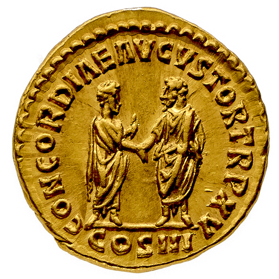 Aureo databile al 161 d.C. NGC AU*, Strike 5/5 Surface 5/5 - Zecca: Roma - Diritto: busto drappeggiato e corazzato dell'Imperatore a destra - Rovescio: Marco Aurelio e Lucio Vero stanti uno di fronte all'altro si stringono la mano - Esemplare di grande freschezza - Cert. #8585056-002