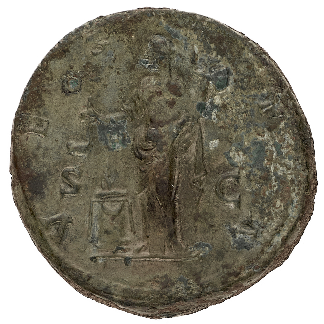 Sesterzio al nome e con l'effigie di Lucilla, moglie dell'Imperatore - Zecca: Roma - Diritto: busto drappeggiato e diademato di Lucilla a destra - Rovescio: Vesta stante a sinistra con un'ara si suoi piedi, tiene con la mano destra un simpulum e con la sinistra un palladium - gr. 25,19 - BB